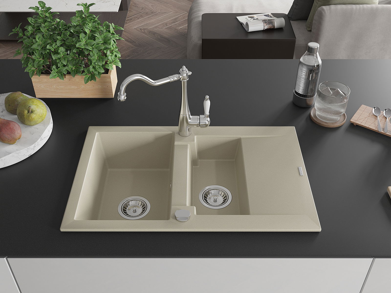 Povrch kuchynského drezu je odolný voči škvrnám a zafarbeniu, vďaka čomu sa ľahko udržiava a zachováva svoju farbu počas dlhého obdobia používania. Estetický a praktický doplnok pre každú kuchyňu.