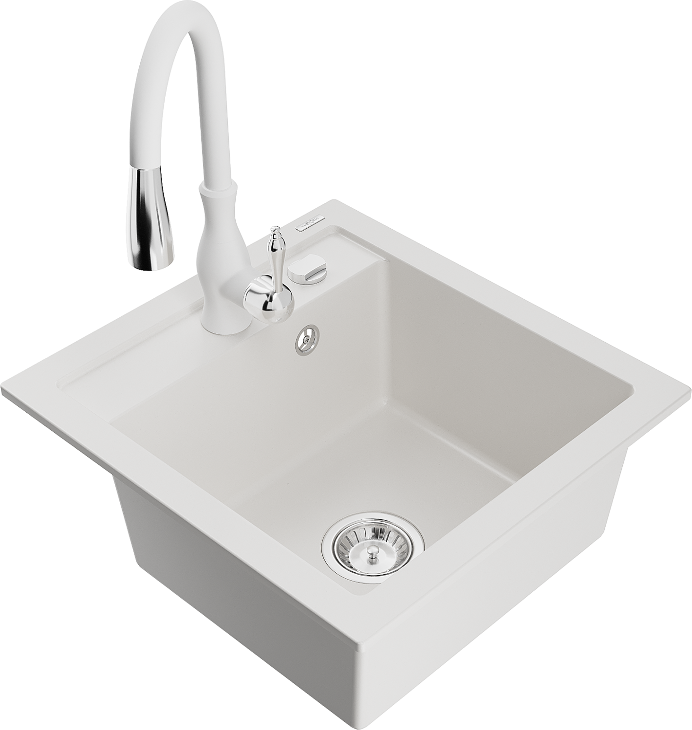 Mexen Vito granitový kuchynský drez, 1-komorový s kuchynskou batériou Savita, biely - 6503-20-672601-20