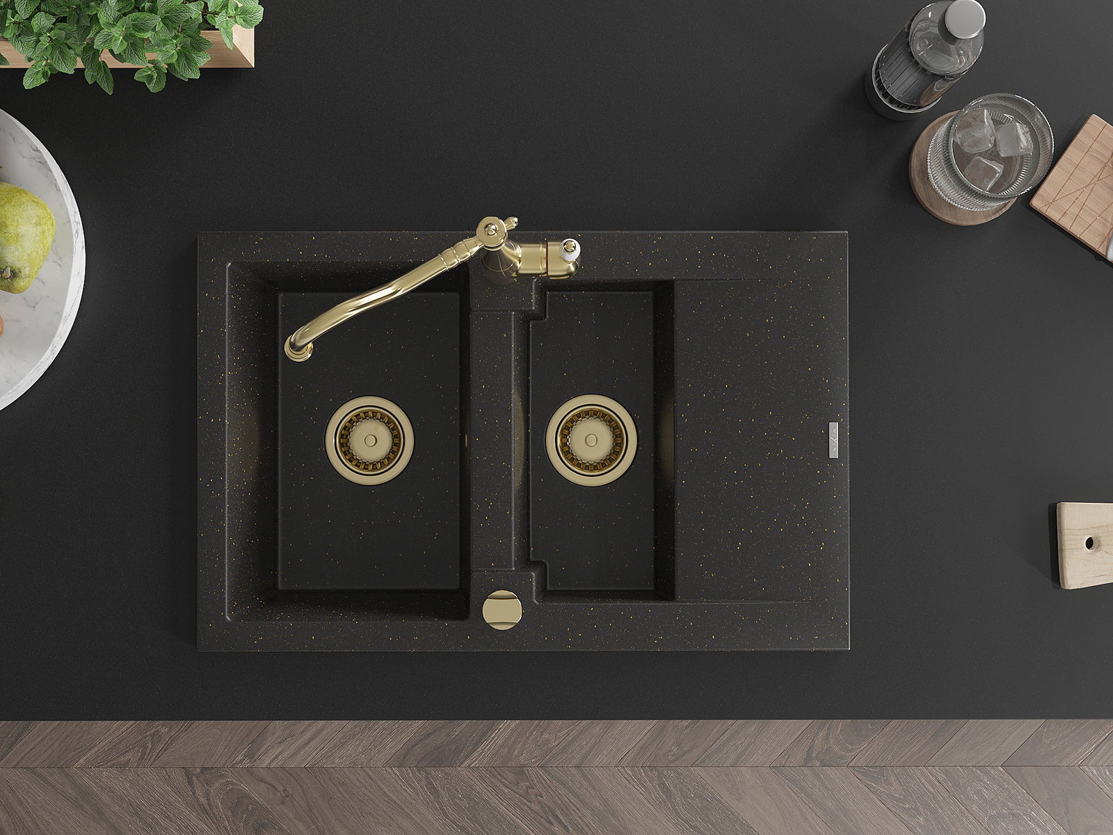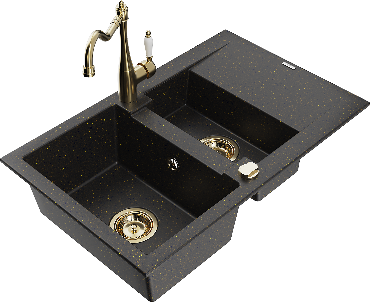 Mexen Gaspar granitový drez 1,5-komorový s odkvapkávačom a kuchynskou batériou Carla, čierny/zlatý metalik