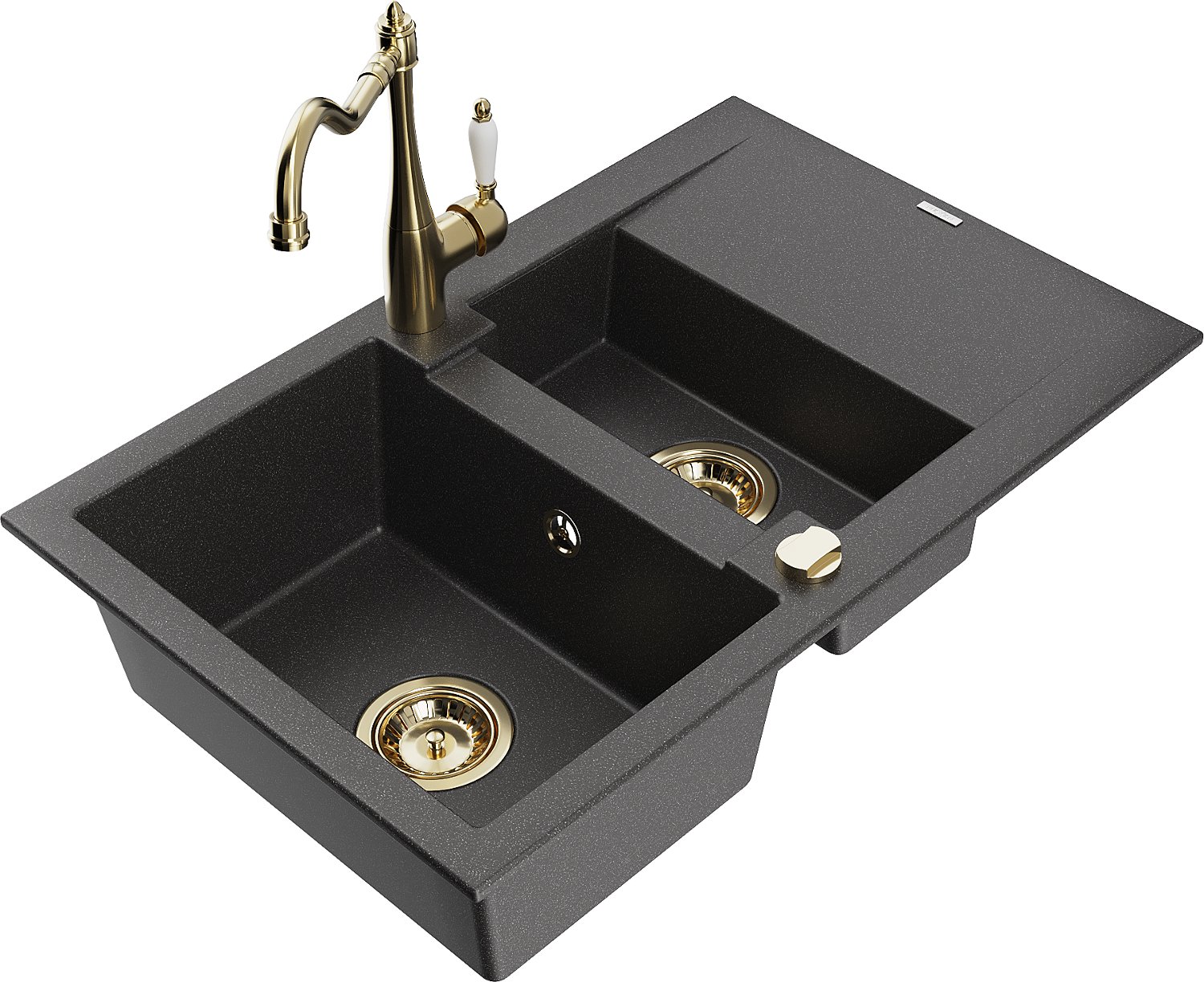 Mexen Gaspar žulový drez 1,5-komorový s odkvapkávačom a kuchynskou batériou Carla, čierny škvrnitý - 6507-76-670700-50
