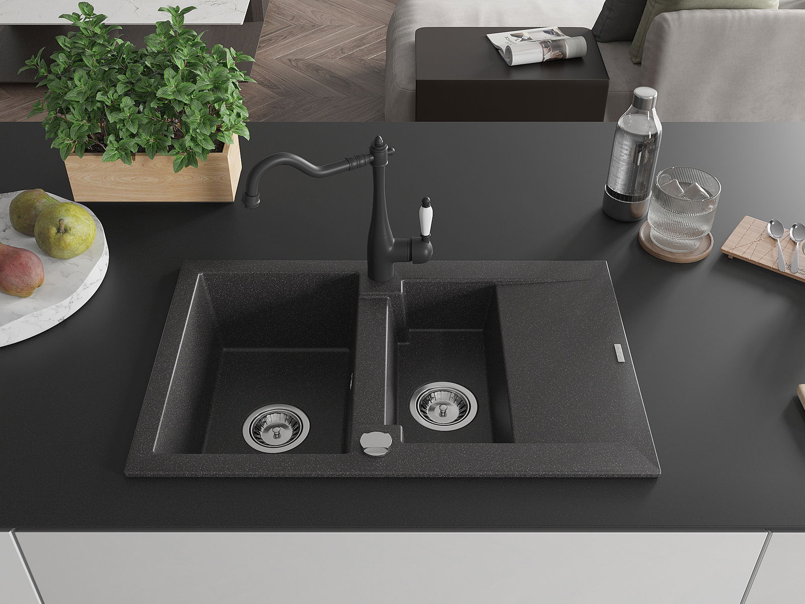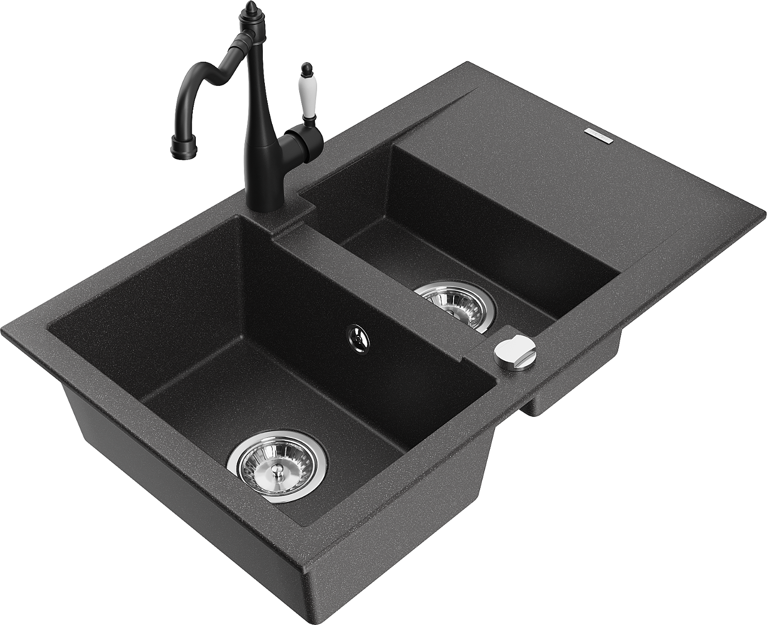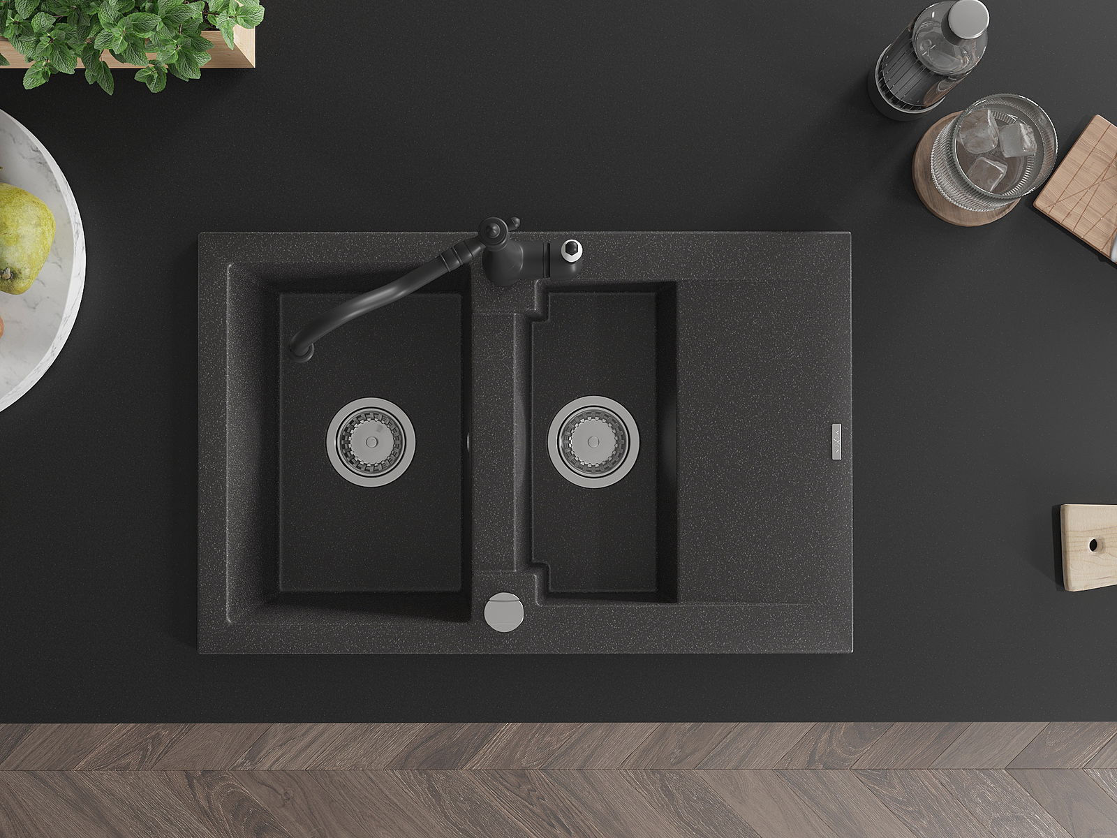 Mexen Gaspar žulový drezy 1,5-komorový s odkvapkávačom a kuchynskou batériou Carla, čierny škvrnitý - 6507-76-670700-70