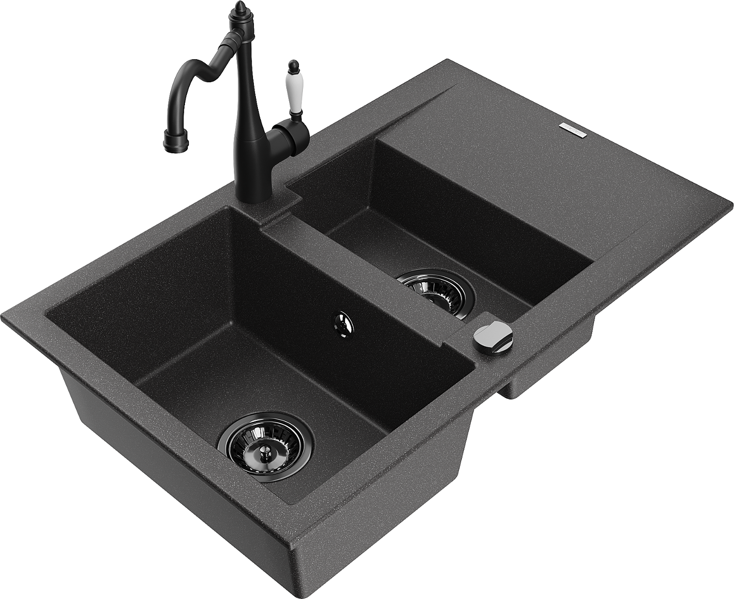 Mexen Gaspar žulový drez 1,5-komorový s odkvapkávačom a kuchynskou batériou Carla, čierny s postriekaním - 6507-76-670700-70-B