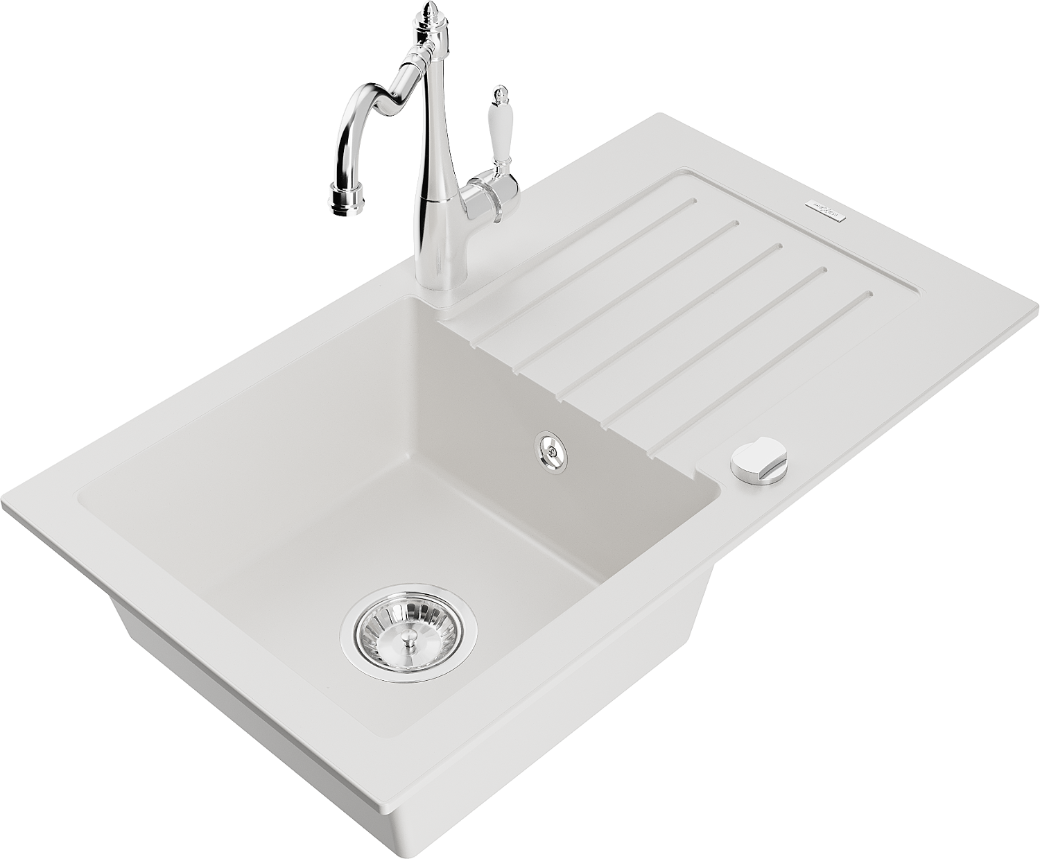 Mexen Pablo žulový drez 1-komorový s odkvapkávačom a kuchynská batéria Carla, biela - 6510-20-670700-00