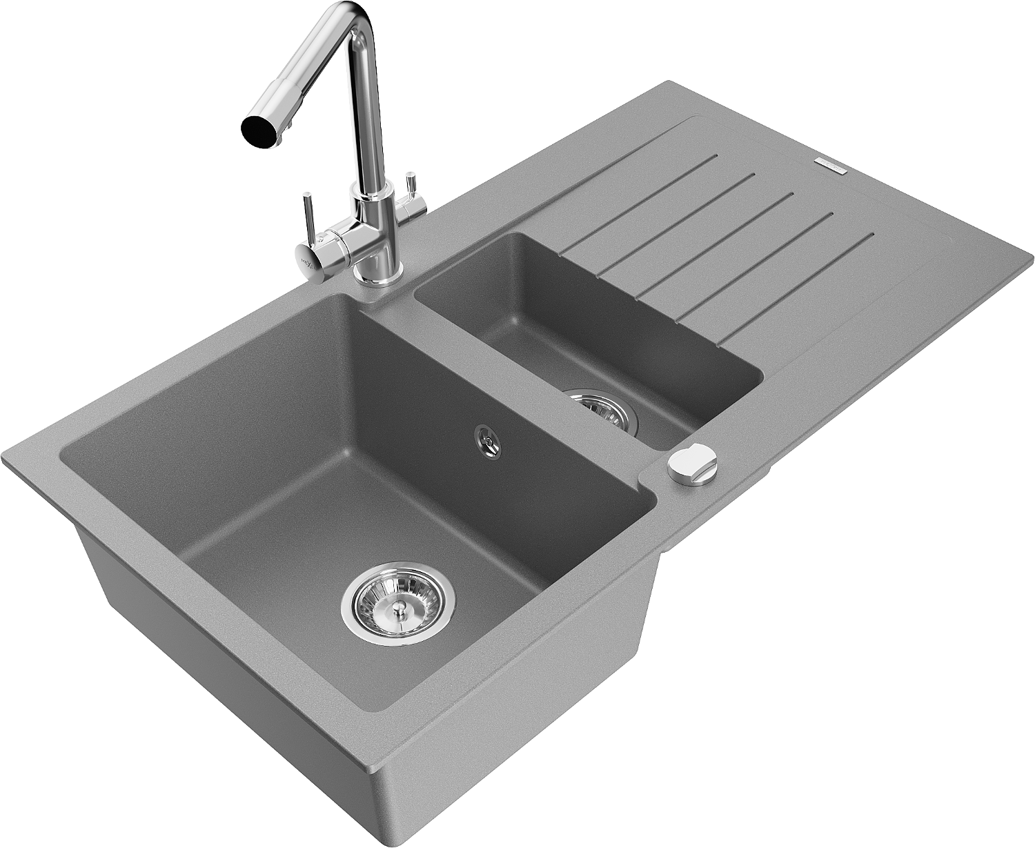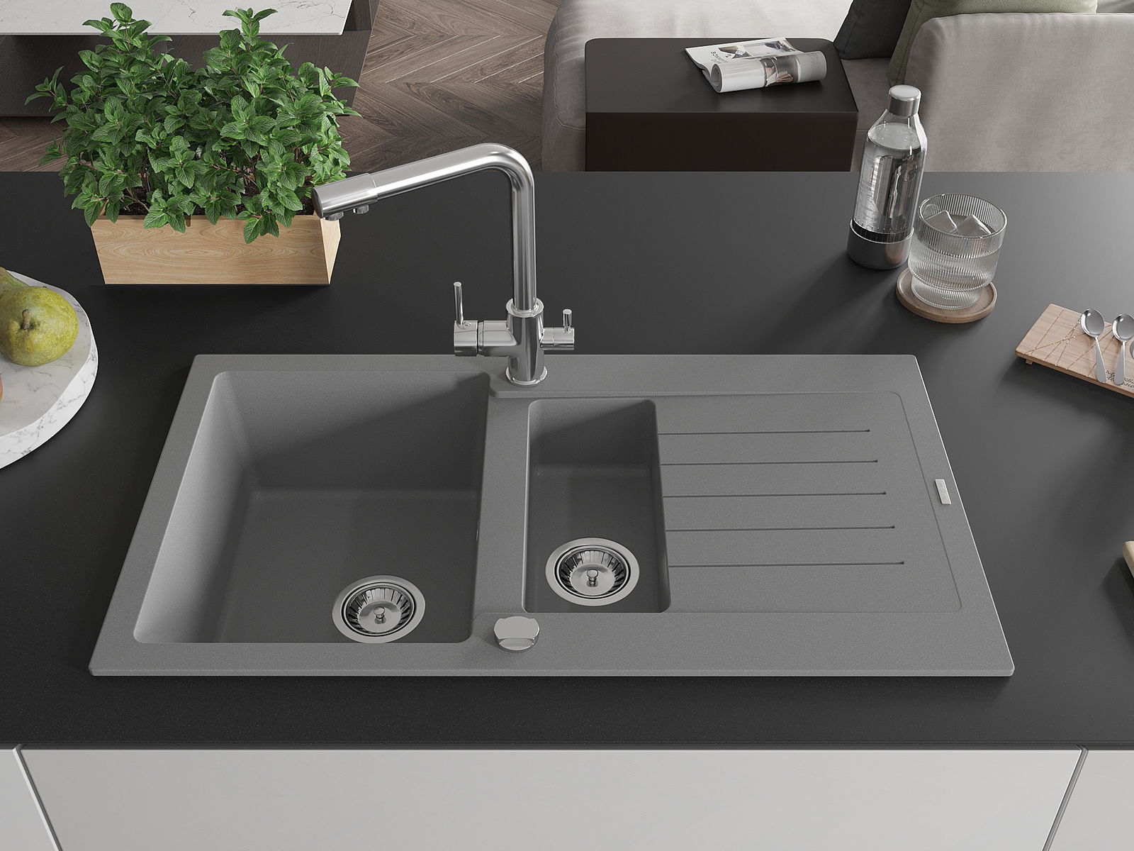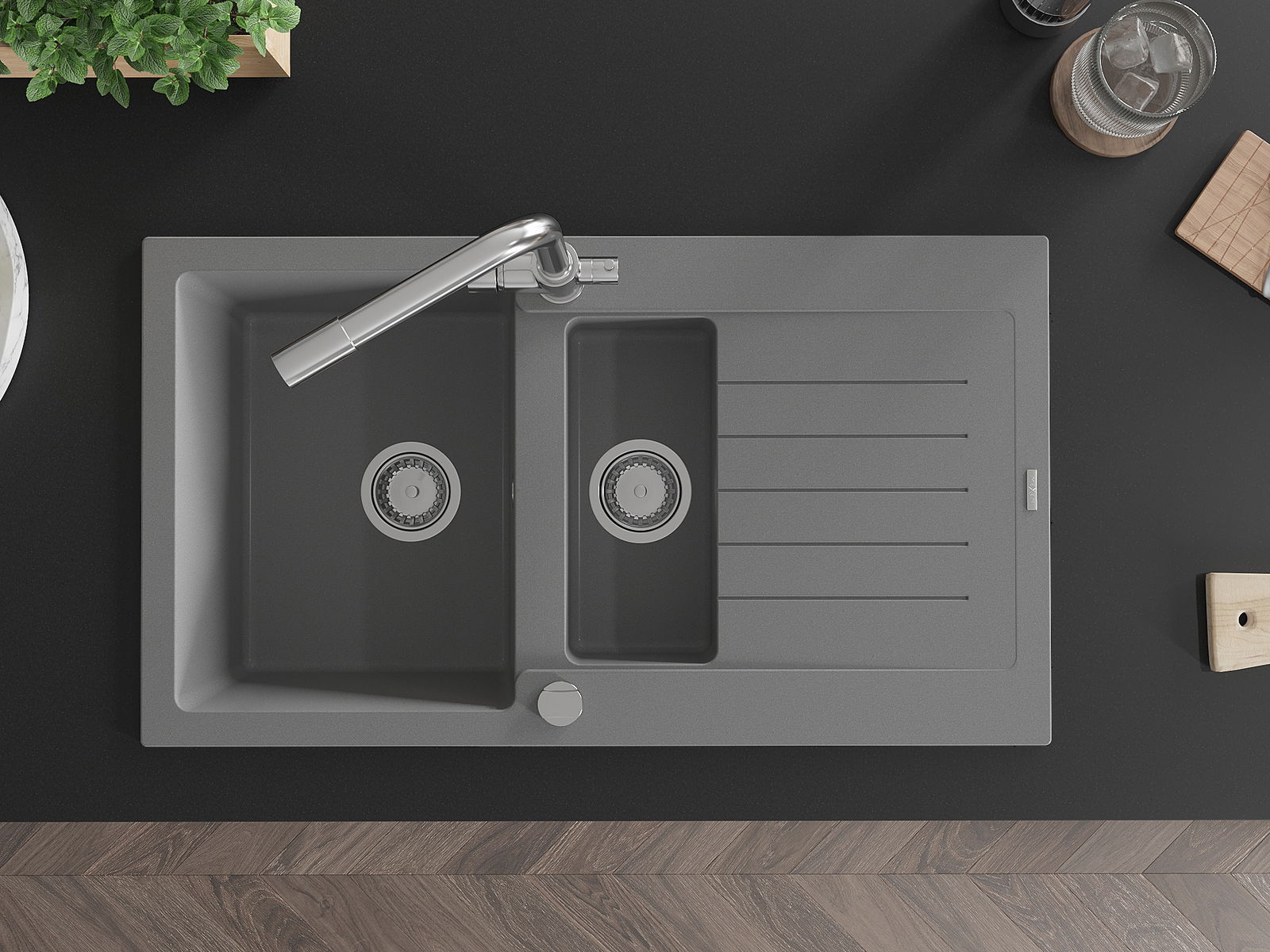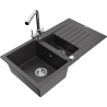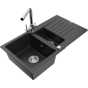 Mexen Matias žulový kuchynský drez 1,5-komorový s odkvapkávačom a kuchynskou batériou Duero, sivý - 6502-71-671600-00