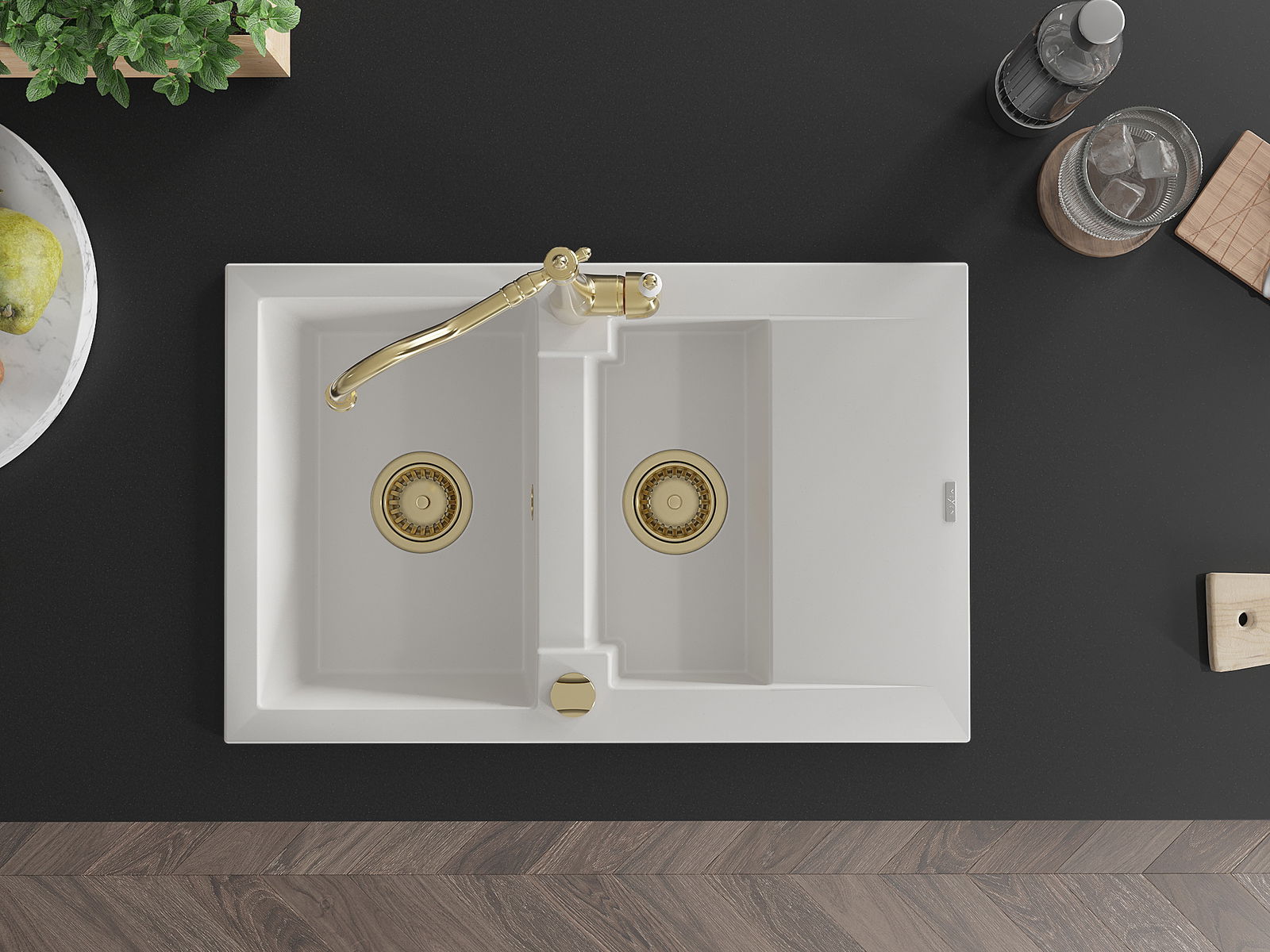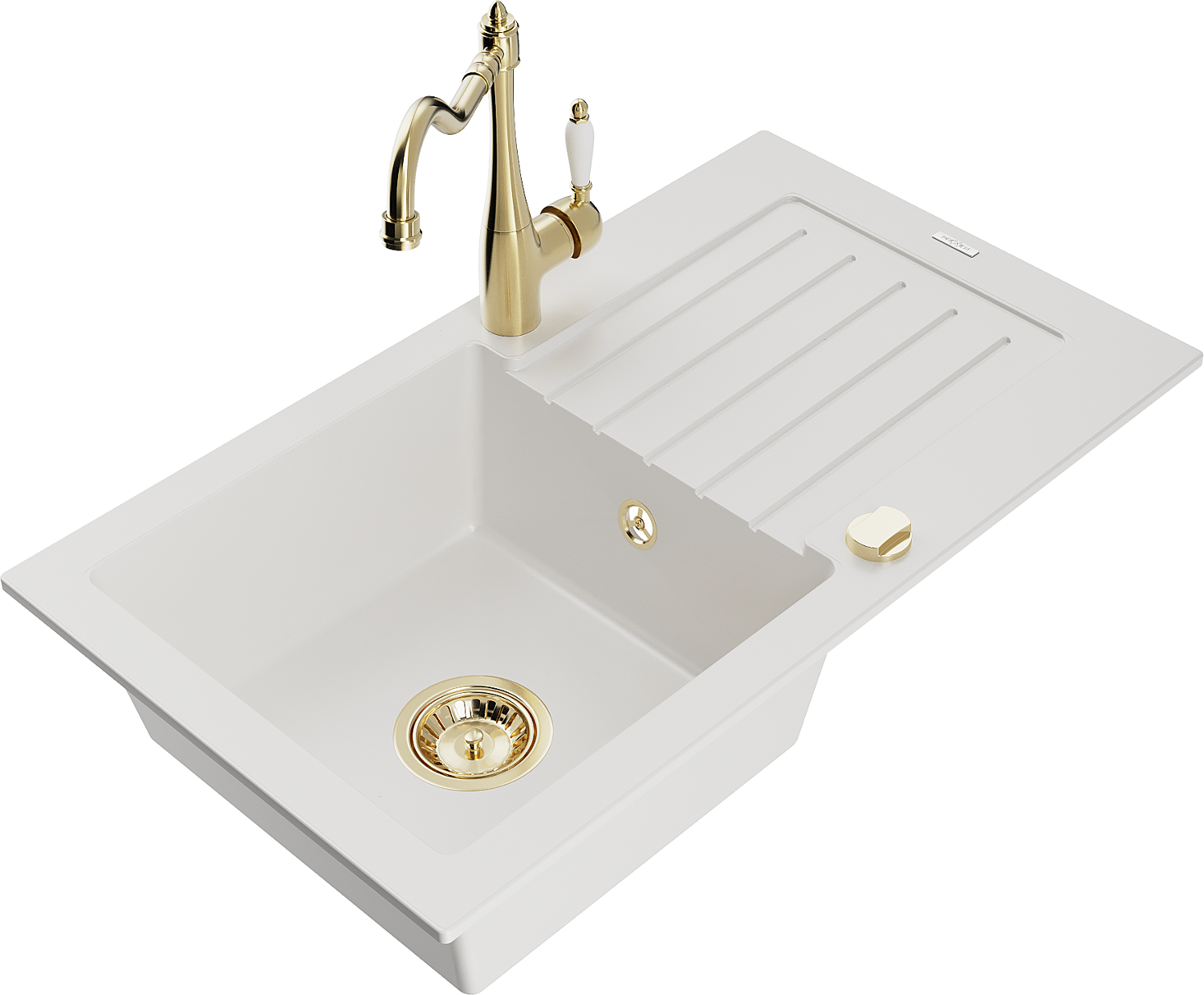 Mexen Pablo granitový drez 1-komorový s odkvapkávačom a kuchynskou batériou Carla, biela - 6510-20-670700-50