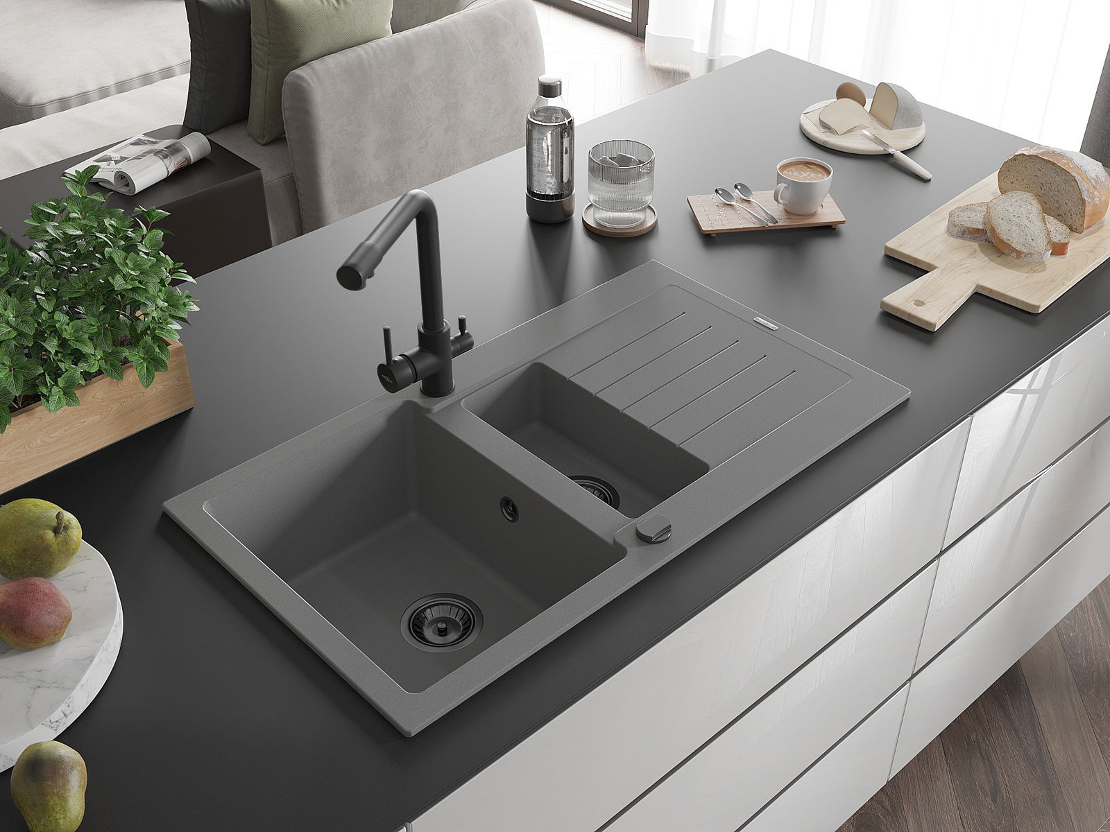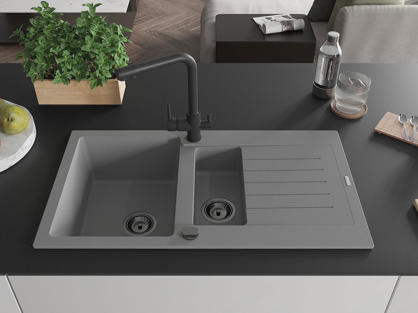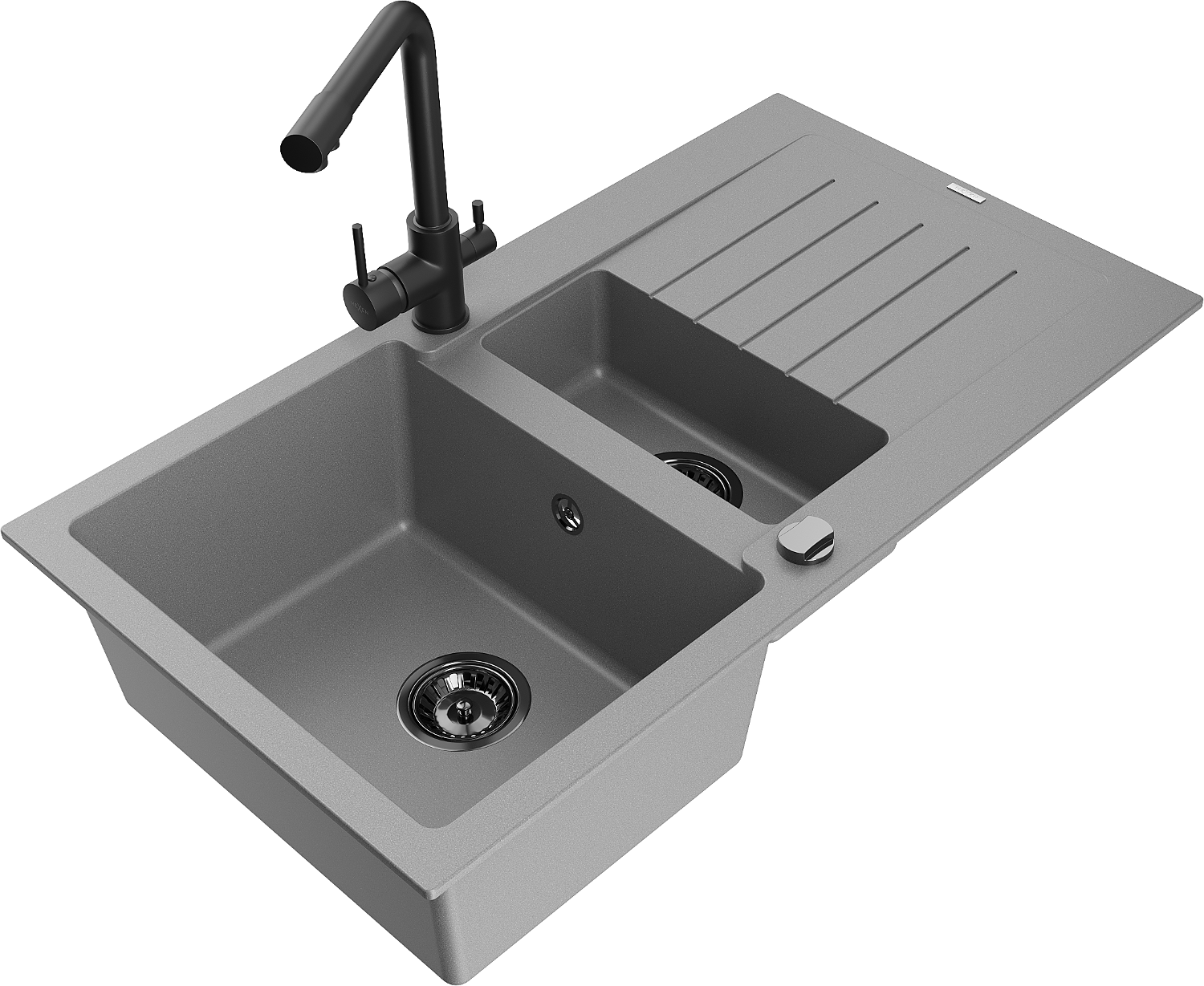 Mexen Matias granitový drez 1,5-komorový s odkvapkávačom a kuchynskou batériou Duero, šedý - 6502-71-671600-70-B