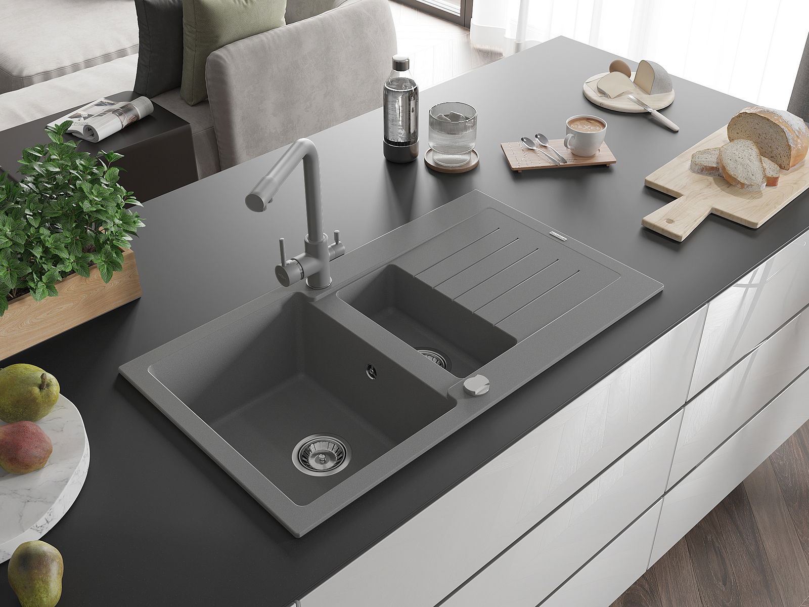 Povrch umývadla je odolný voči škvrnám a sfarbeniu, vďaka čomu sa ľahko čistí a zachováva si svoju farbu po dlhú dobu. Estetický a prakticky dopĺňajúci každú kuchyňu.