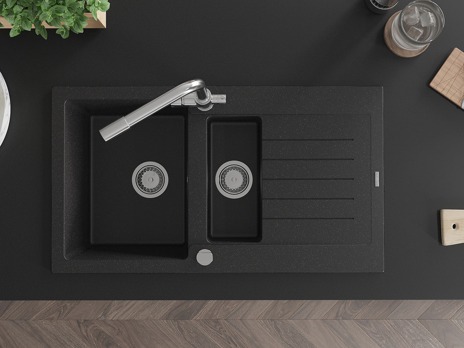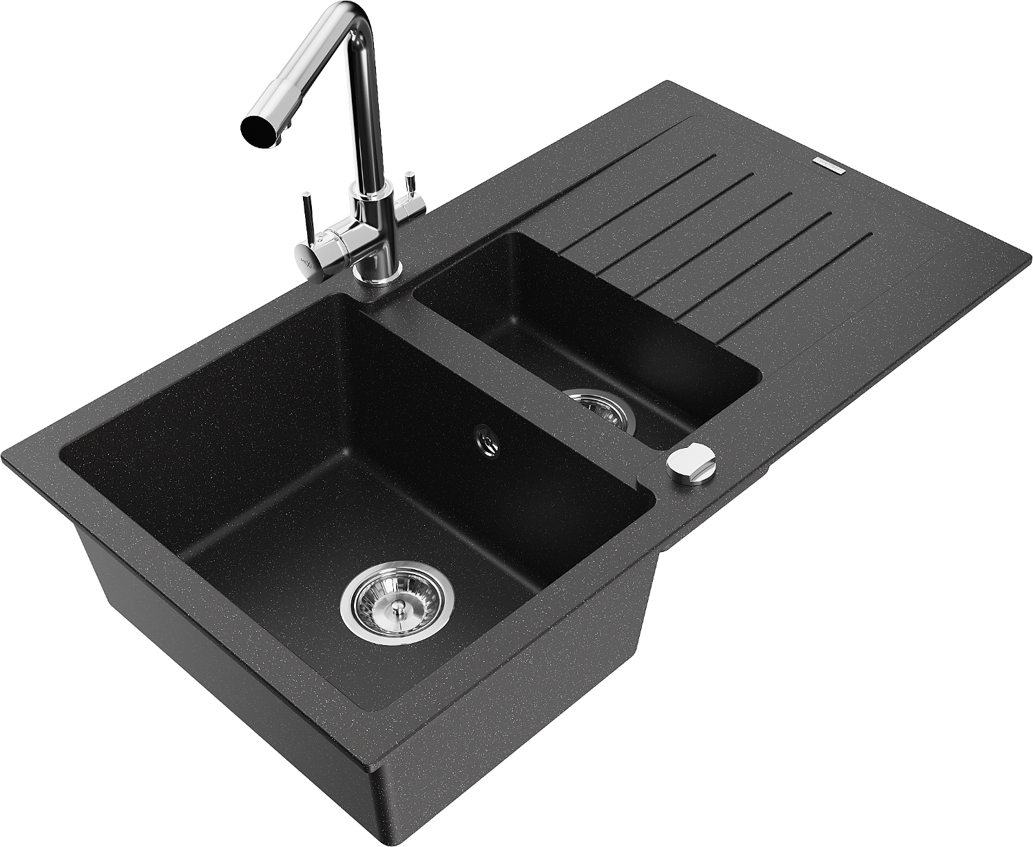 Mexen Matias granitový drez 1,5-komorový s odkvapkávačom a kuchynskou batériou Duero, čierny/strieborný metalický