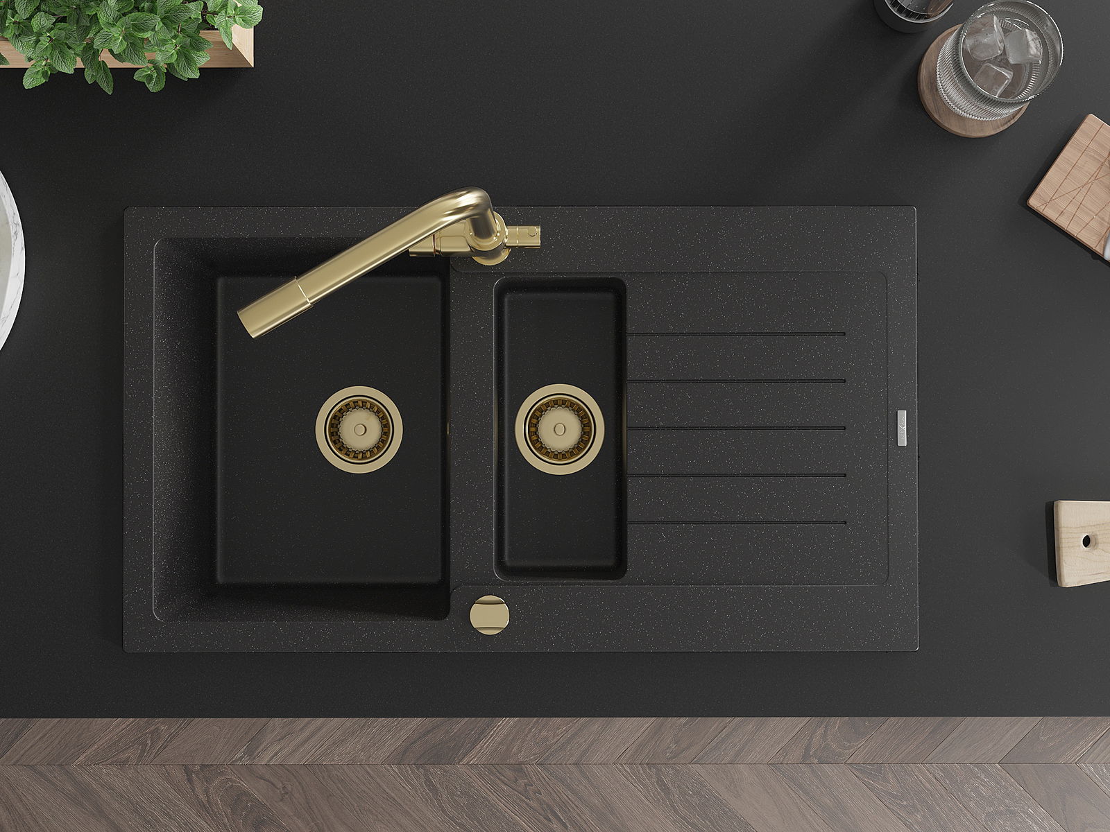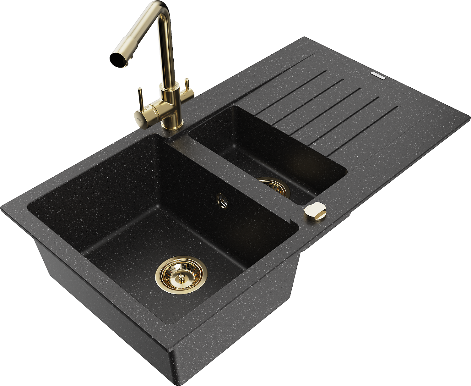Mexen Matias granitový drez 1,5-komorový s odkvapkávačom a kuchynskou batériou Duero, čierny/strieborný metalik
