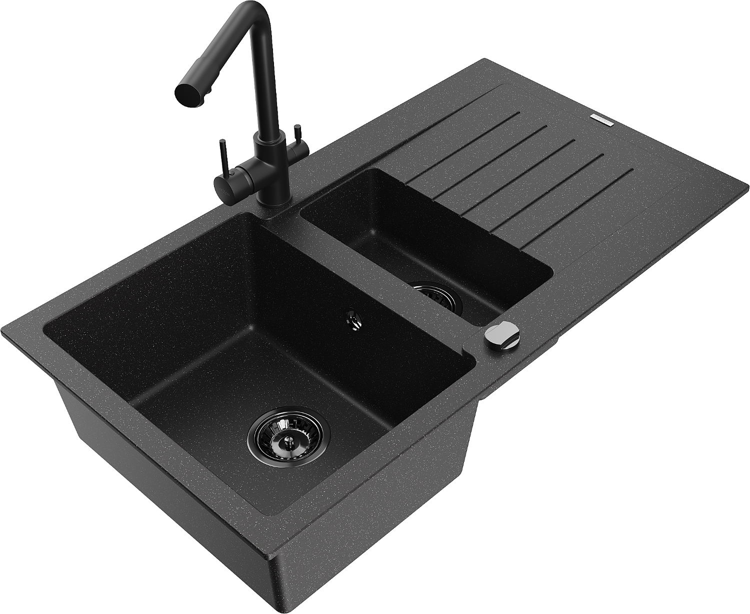 Mexen Matias žulový drez s 1,5 komorou a odkvapkávačom a kuchynskou batériou Duero, čierny/strieborný - 6502-73-671600-70-B
