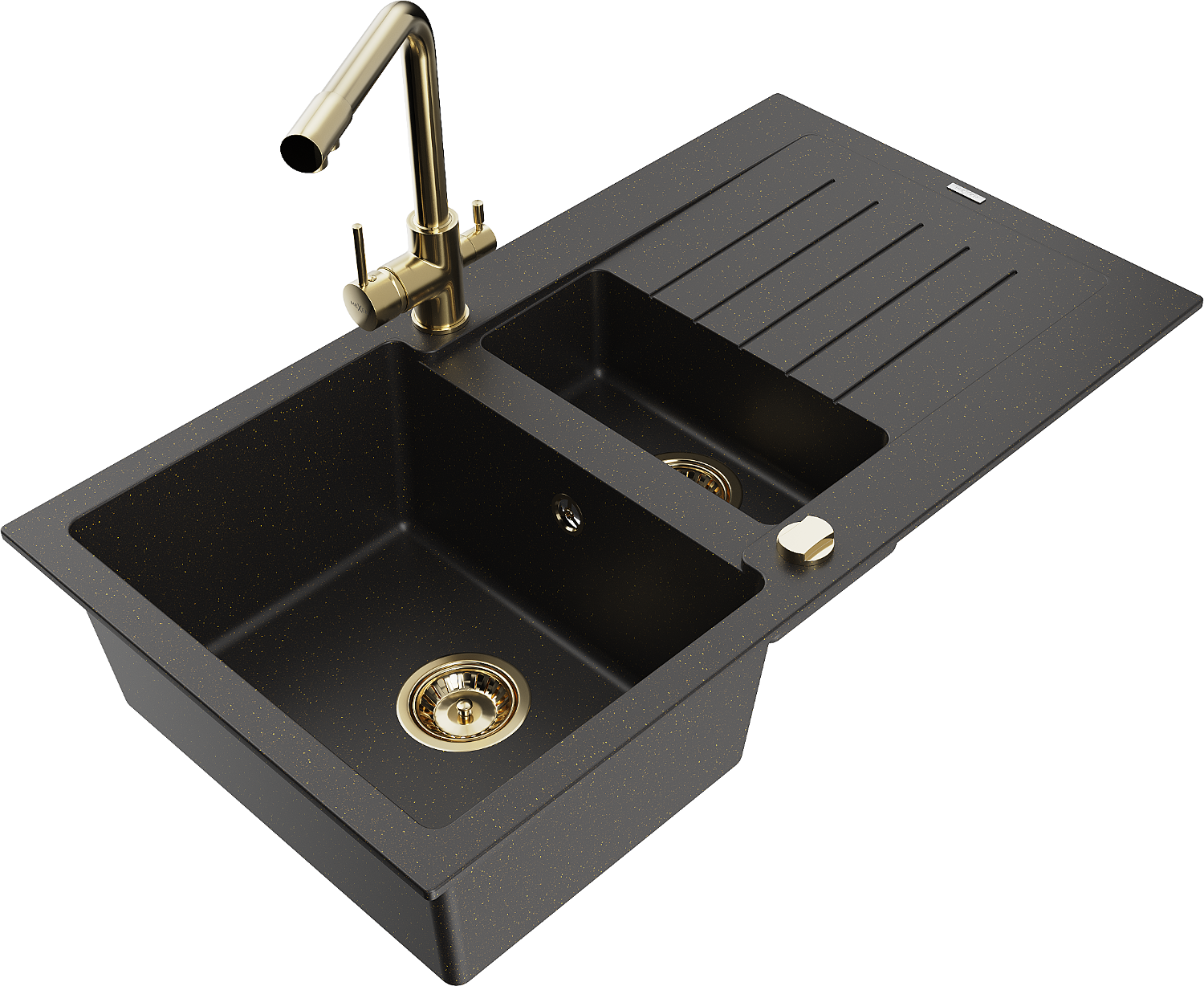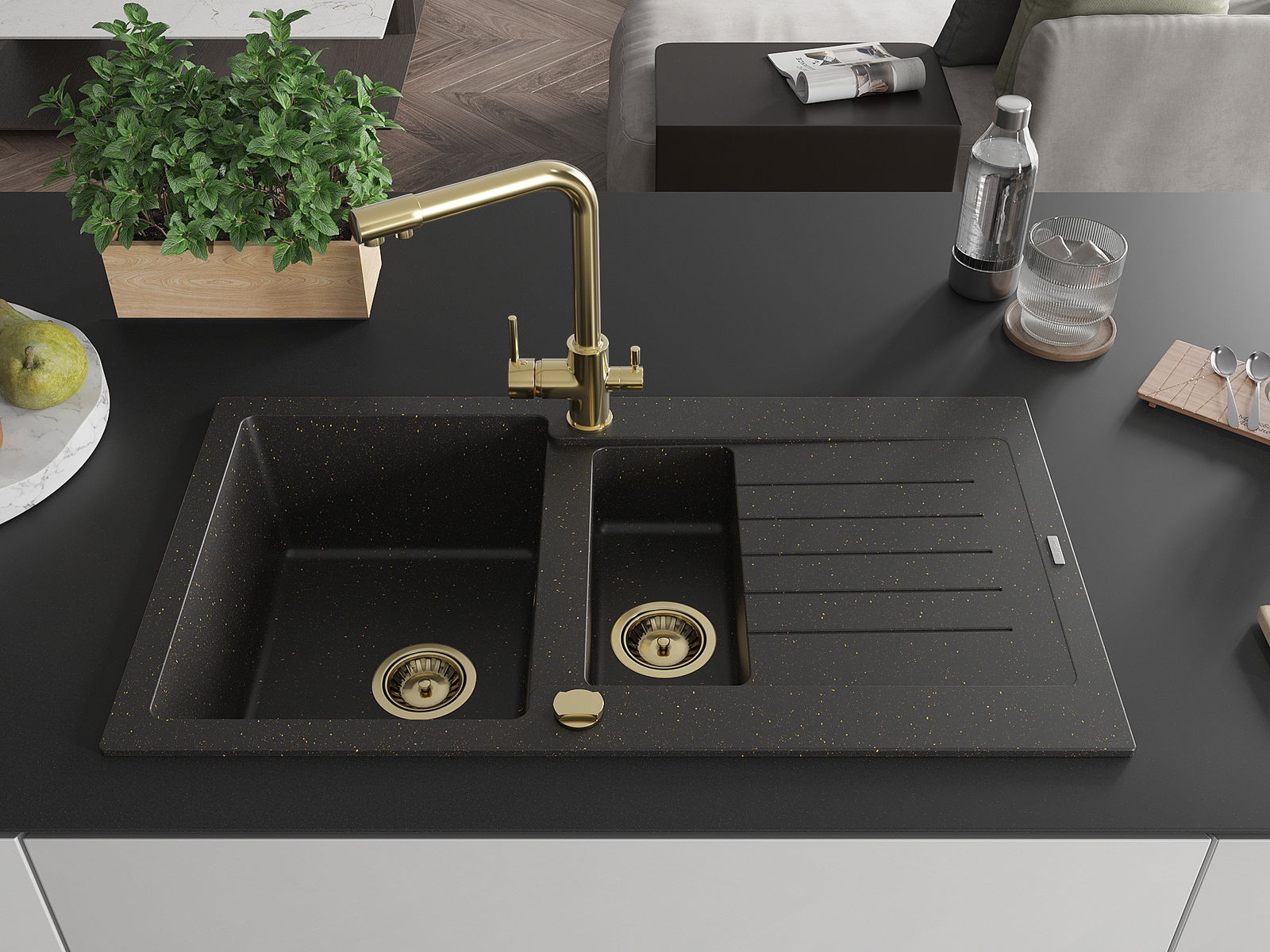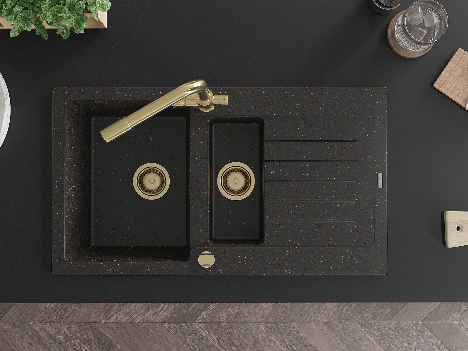 Mexen Matias granitový drez 1,5-komorový s odkvapkávačom a kuchynskou batériou Duero, čierny/zlatý metalický