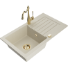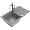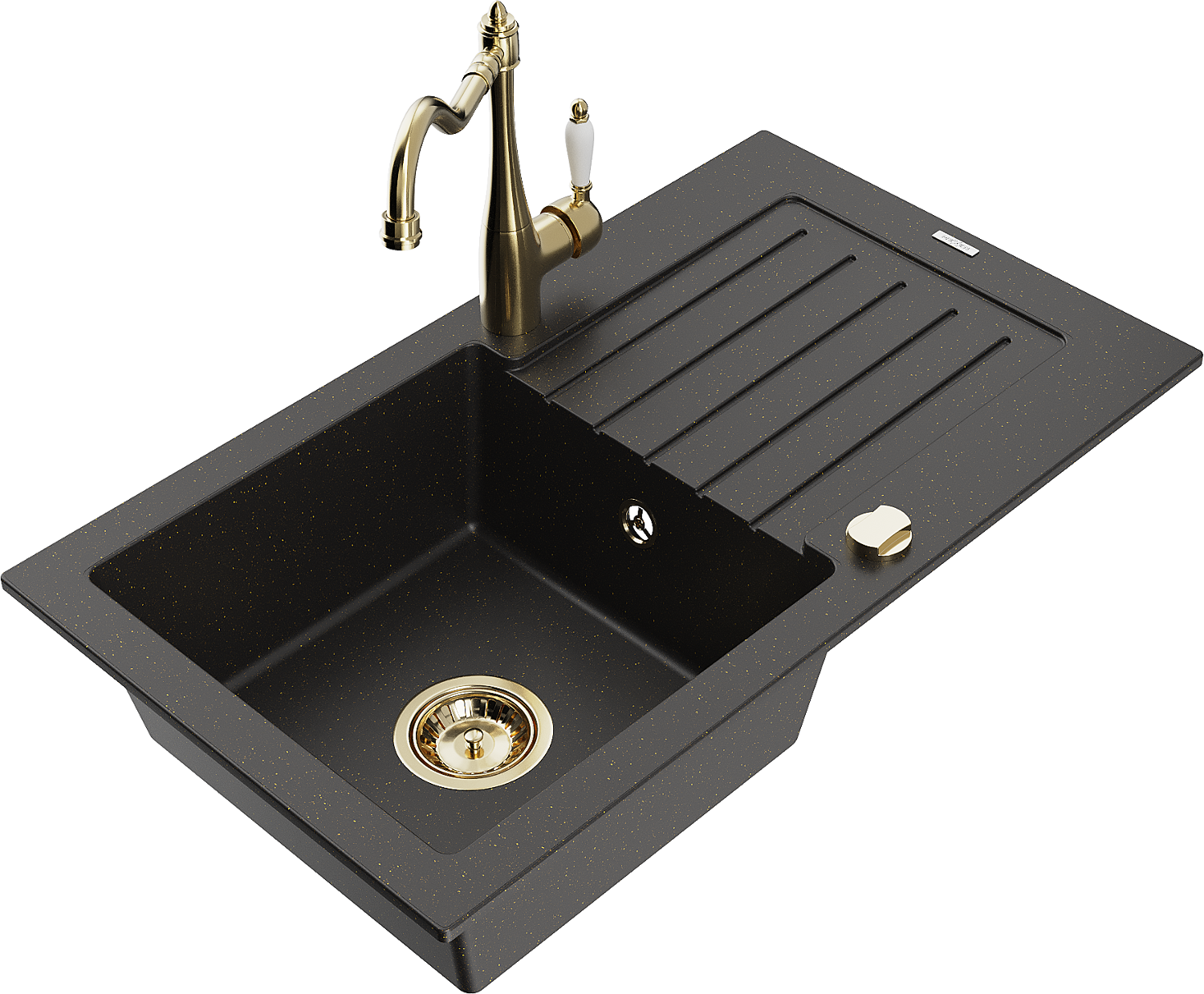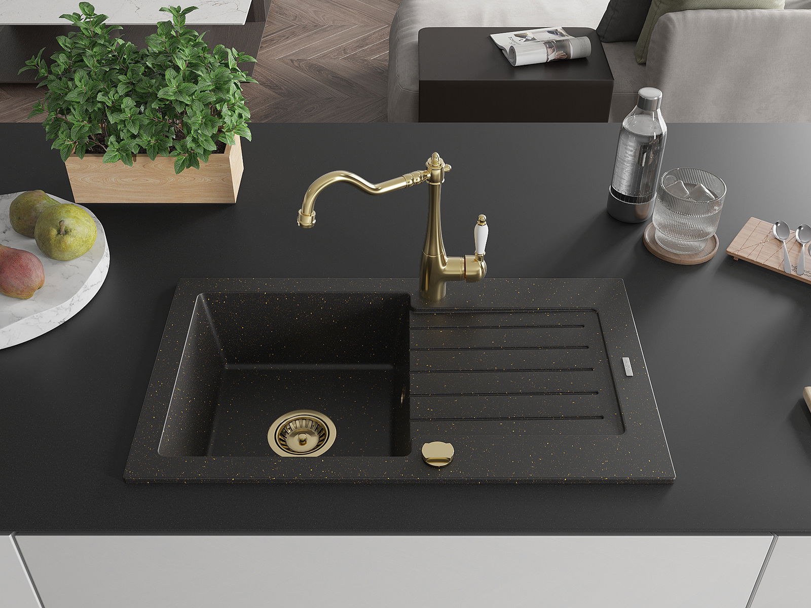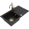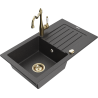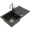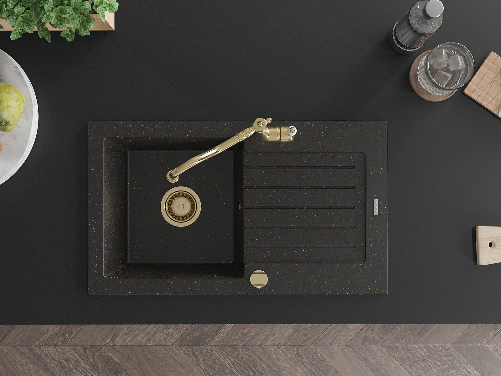 Mexen Pablo granitový jednodrez s odkvapkávačom a kuchynskou batériou Carla, čierny/zlatý metalický - 6510-75-670700-50