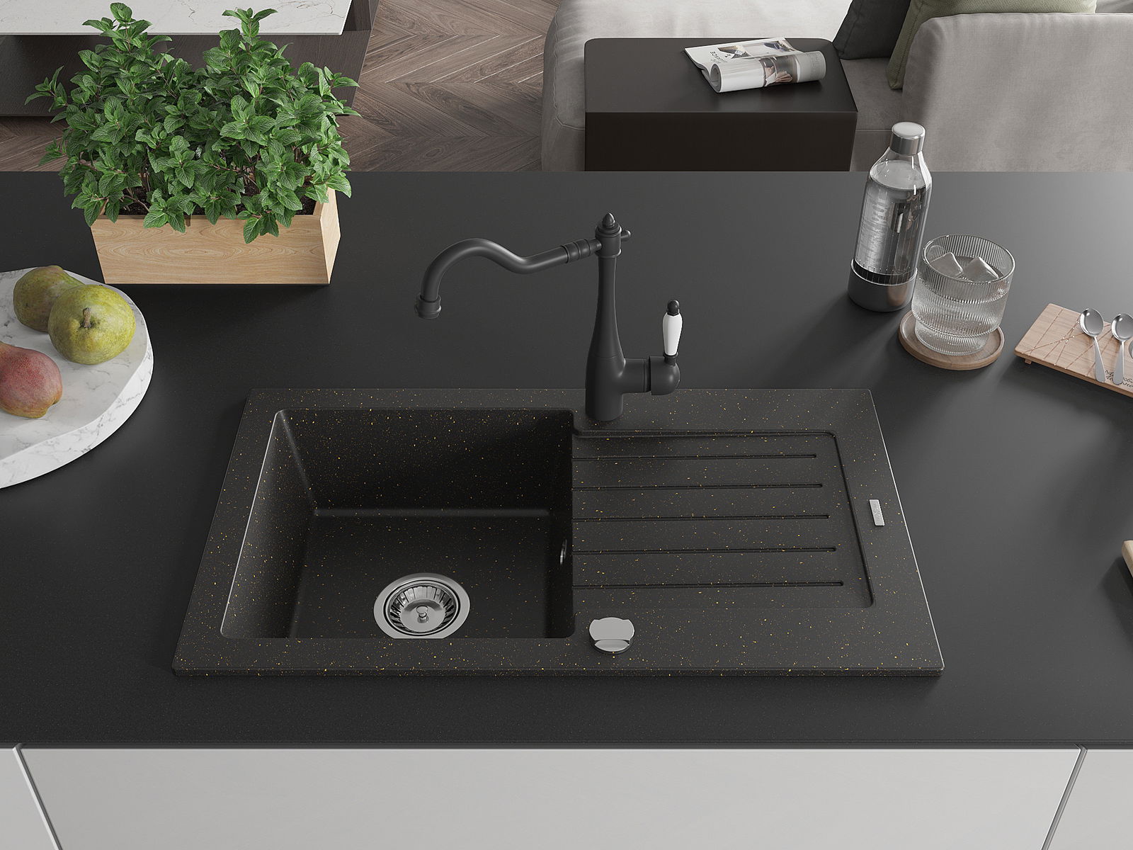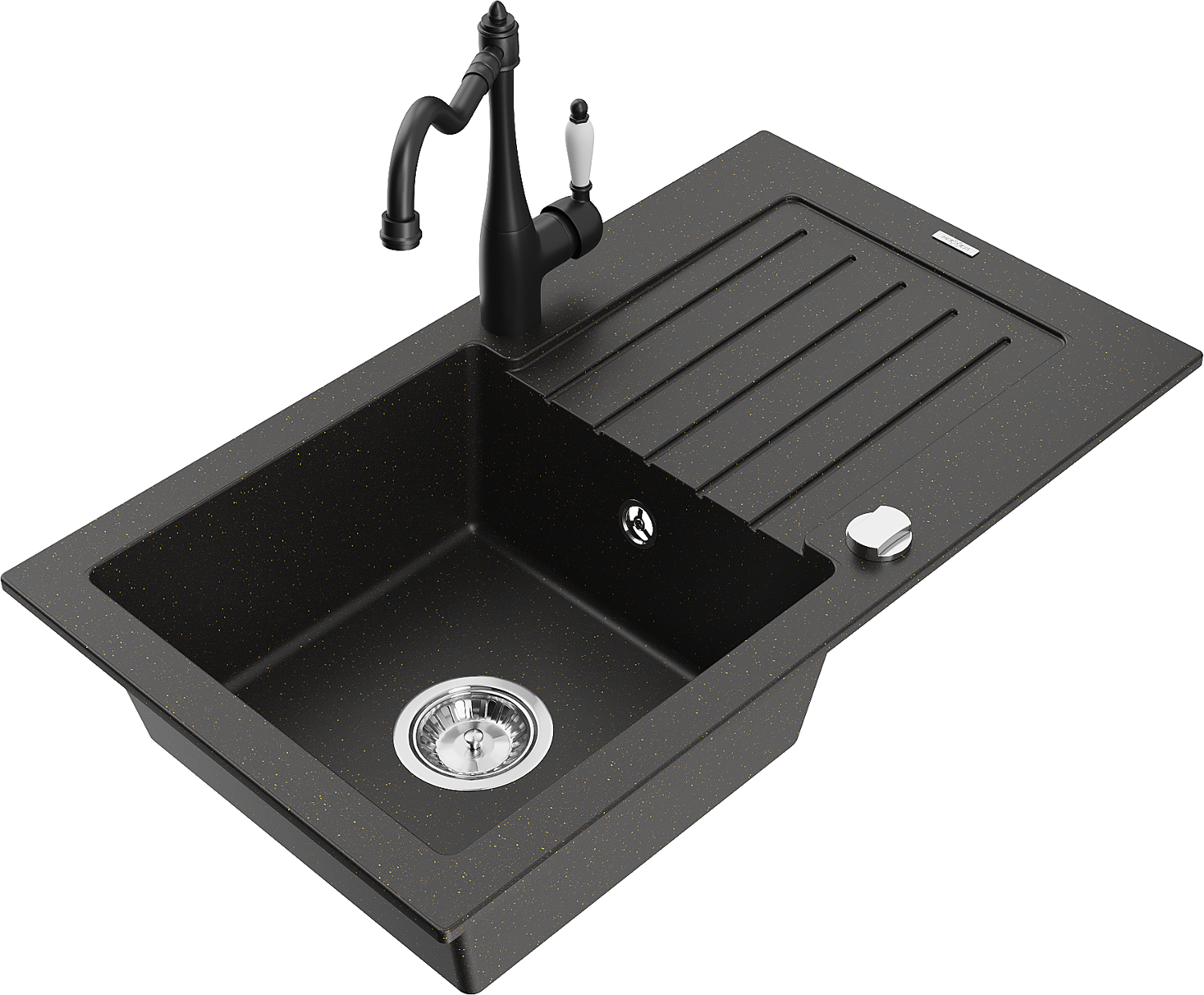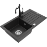 Mexen Pablo granitový drez 1-komorový s odkvapkávačom a kuchynskou batériou Carla, čierno/zlatý metalik - 6510-75-670700-70