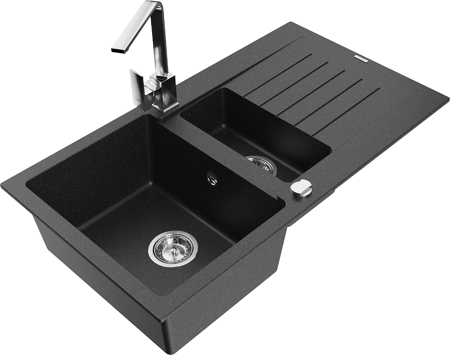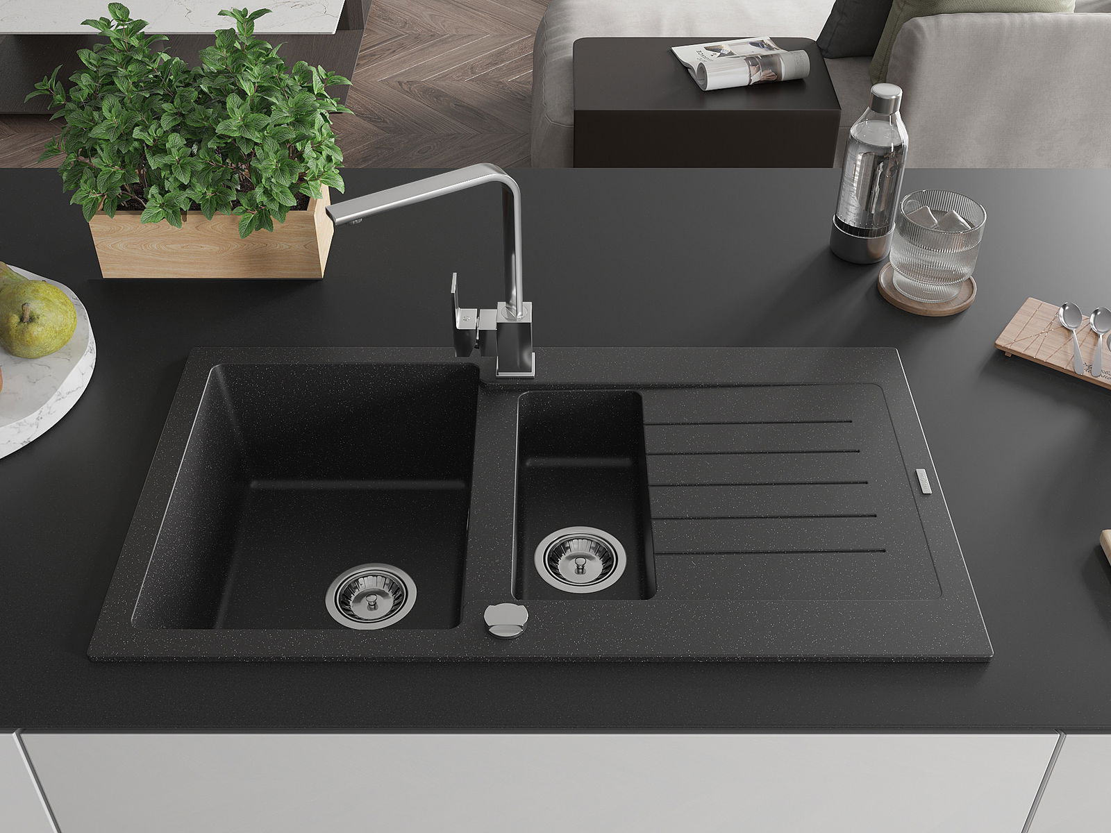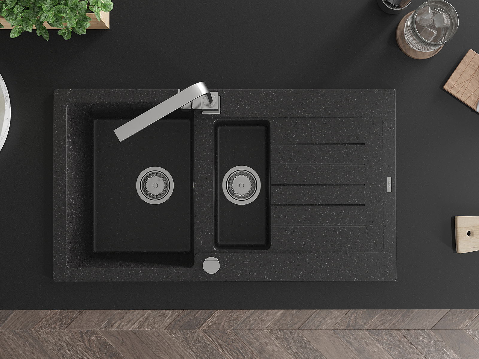 Mexen Matias granitový drez 1,5-komorový s odkvapkávačom a kuchynskou batériou Rita, čierny/strieborný metalik