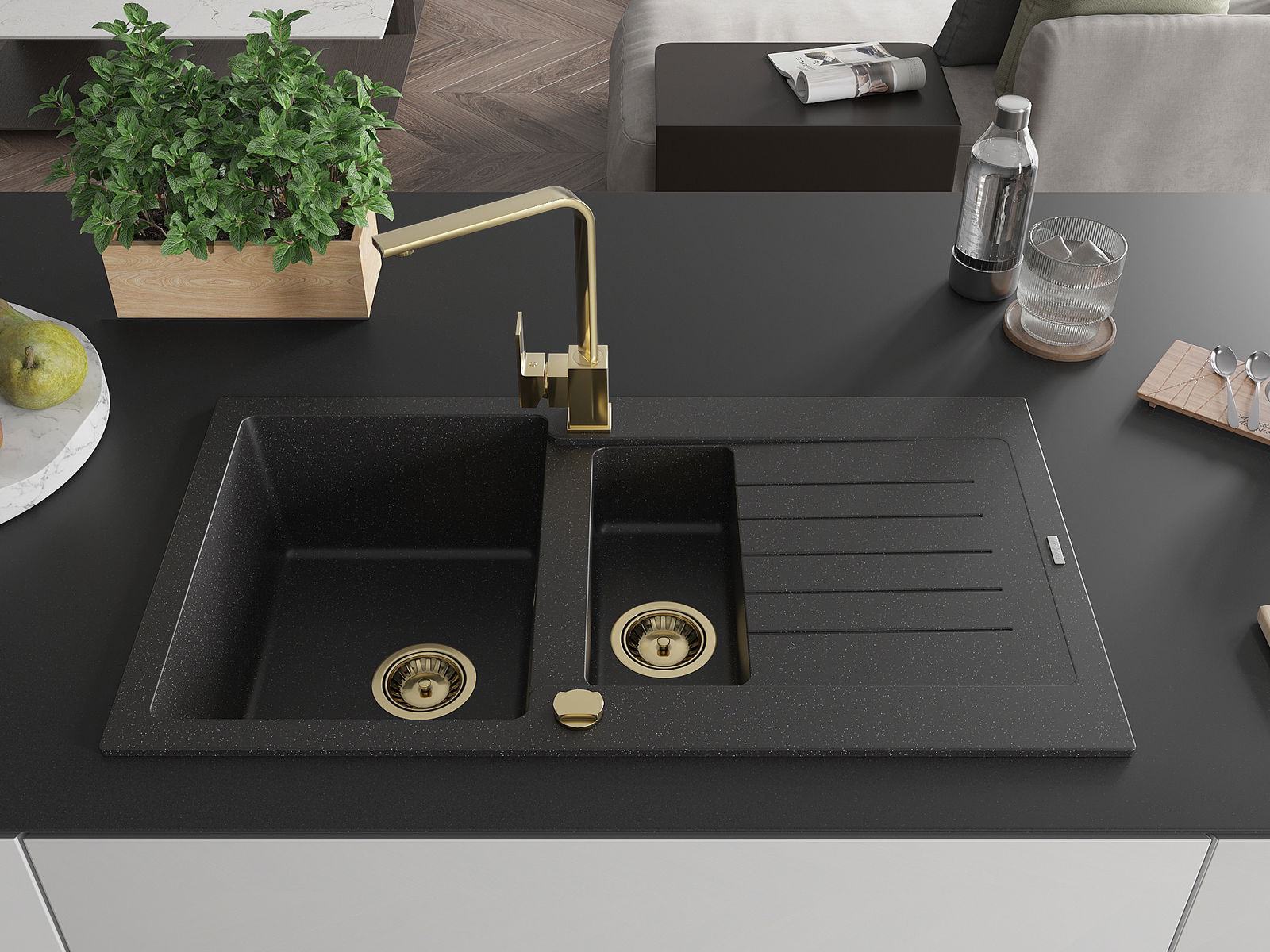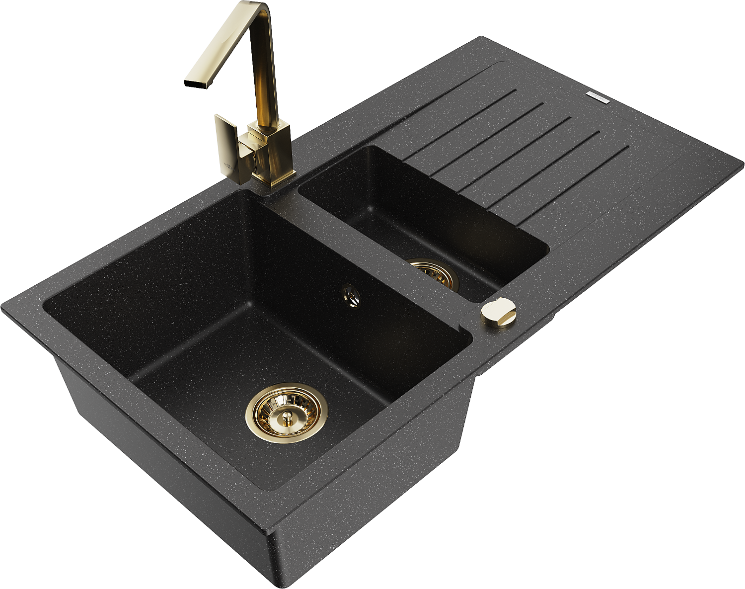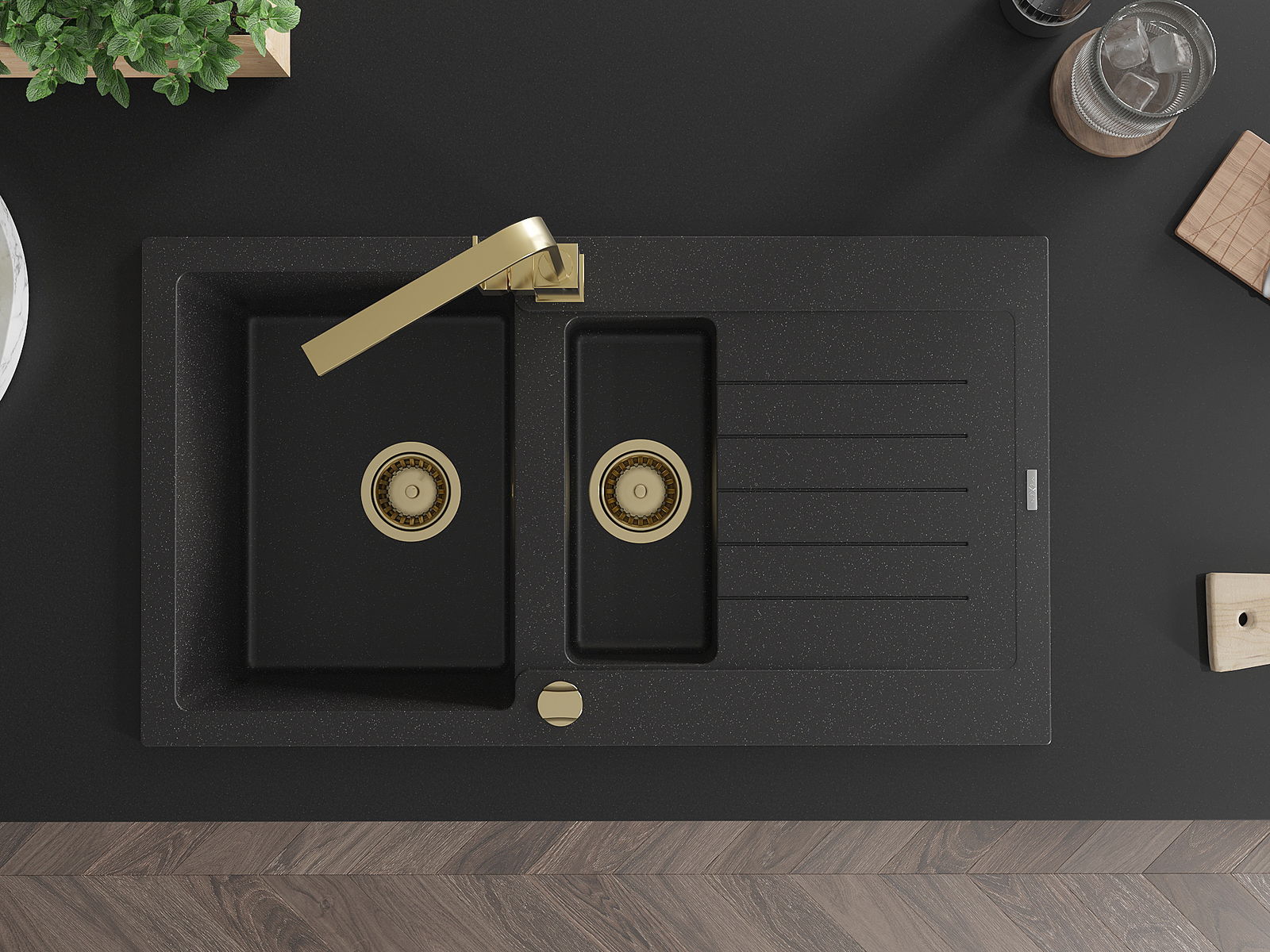 Mexen Matias granitový drez 1,5-komorový s odkvapkávačom a kuchynskou batériou Rita, čierny/strieborný metalický