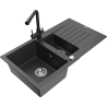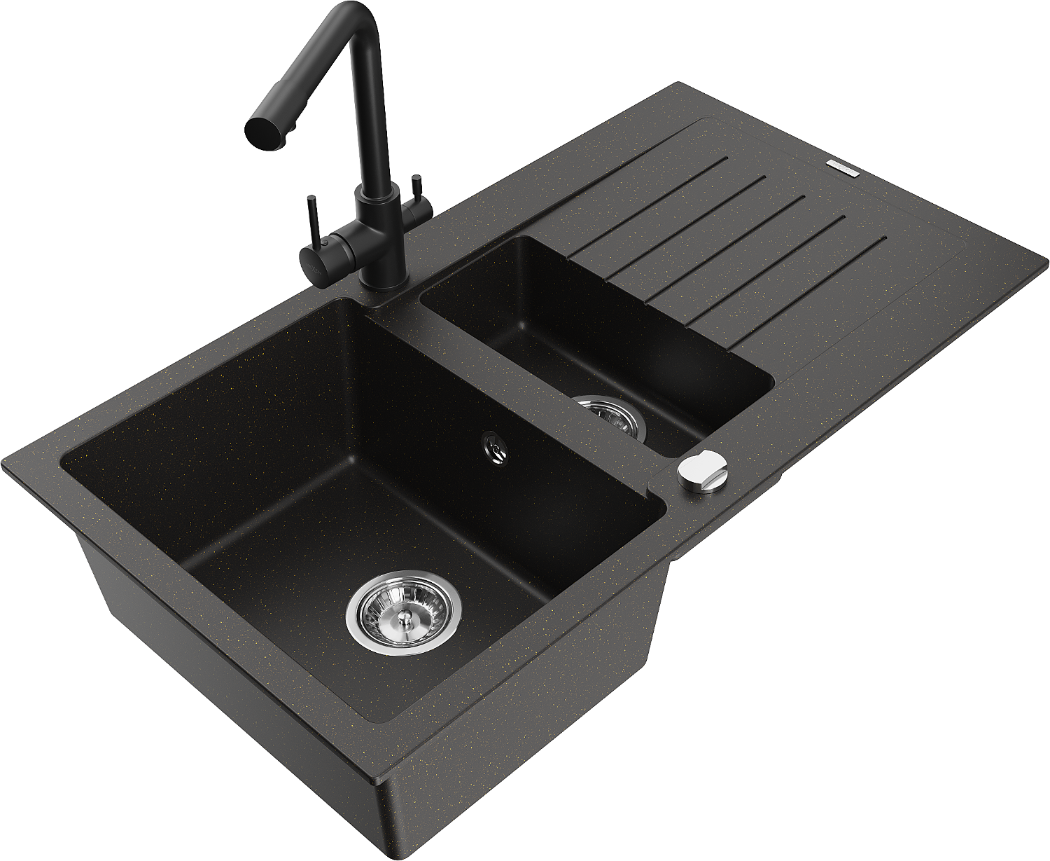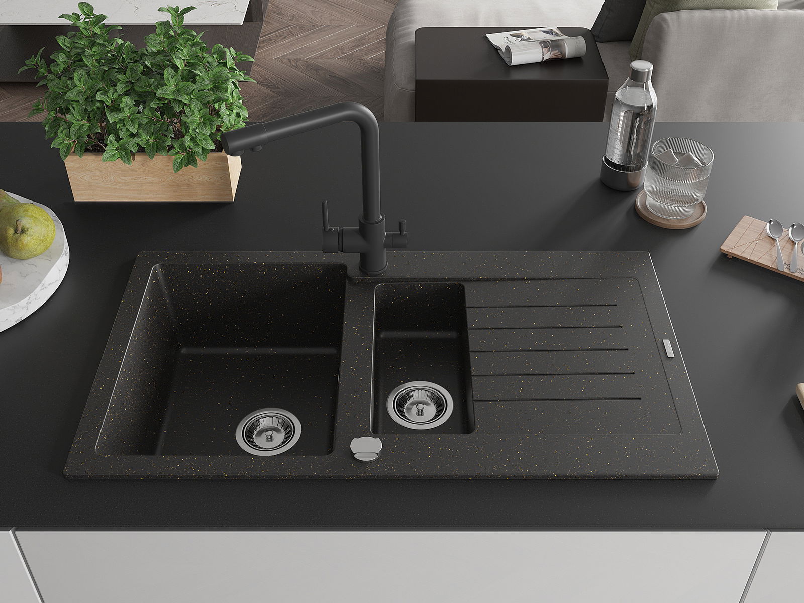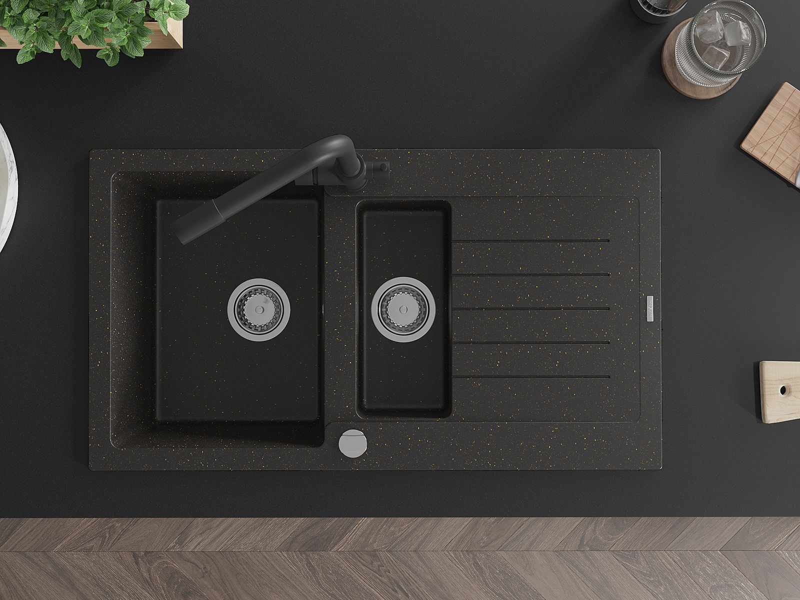 Mexen Matias granitový drez s 1,5 komorou s odkvapkávačom a kuchynskou batériou Duero, čierny/zlatý metalík