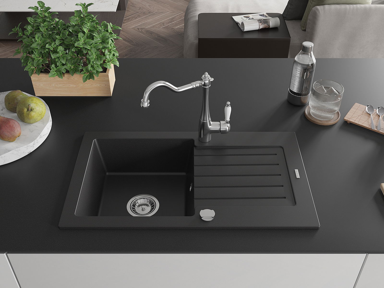 Povrch umývadla je odolný voči škvrnám a sfarbeniu, vďaka čomu sa ľahko čistí a zachováva si svoju farbu po dlhú dobu. Estetický a prakticky dopĺňajúci každú kuchyňu.