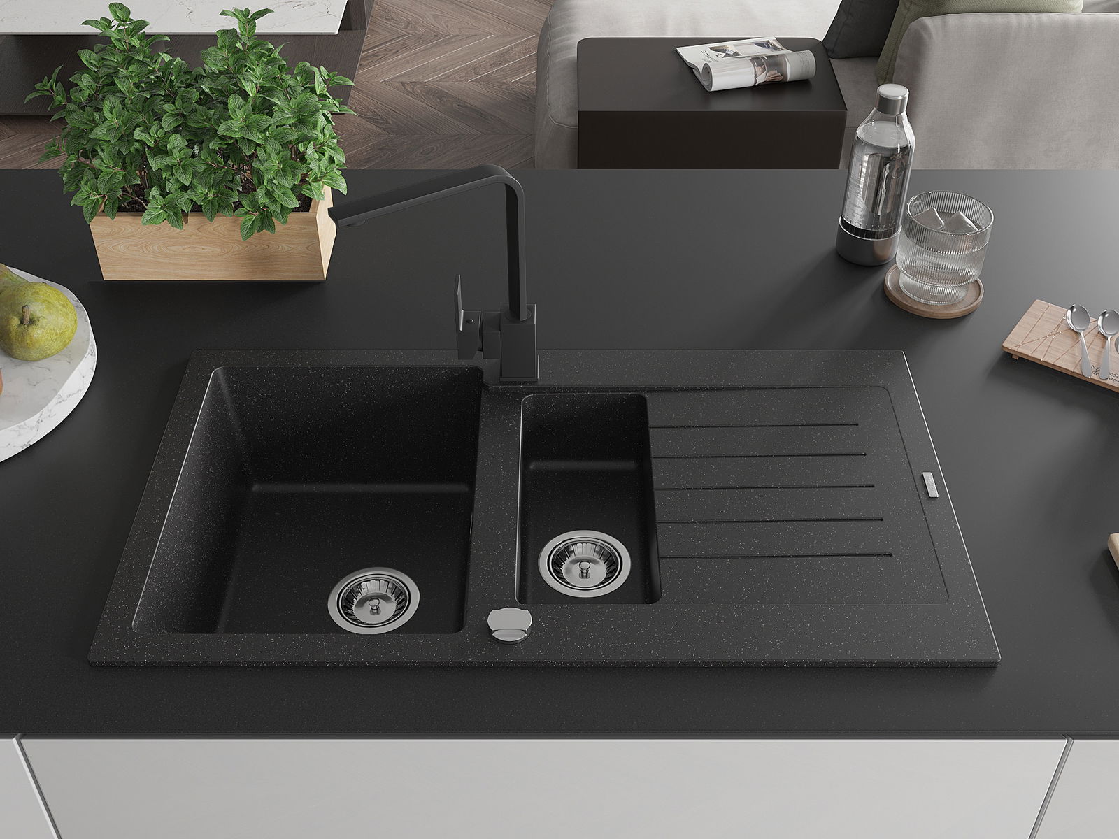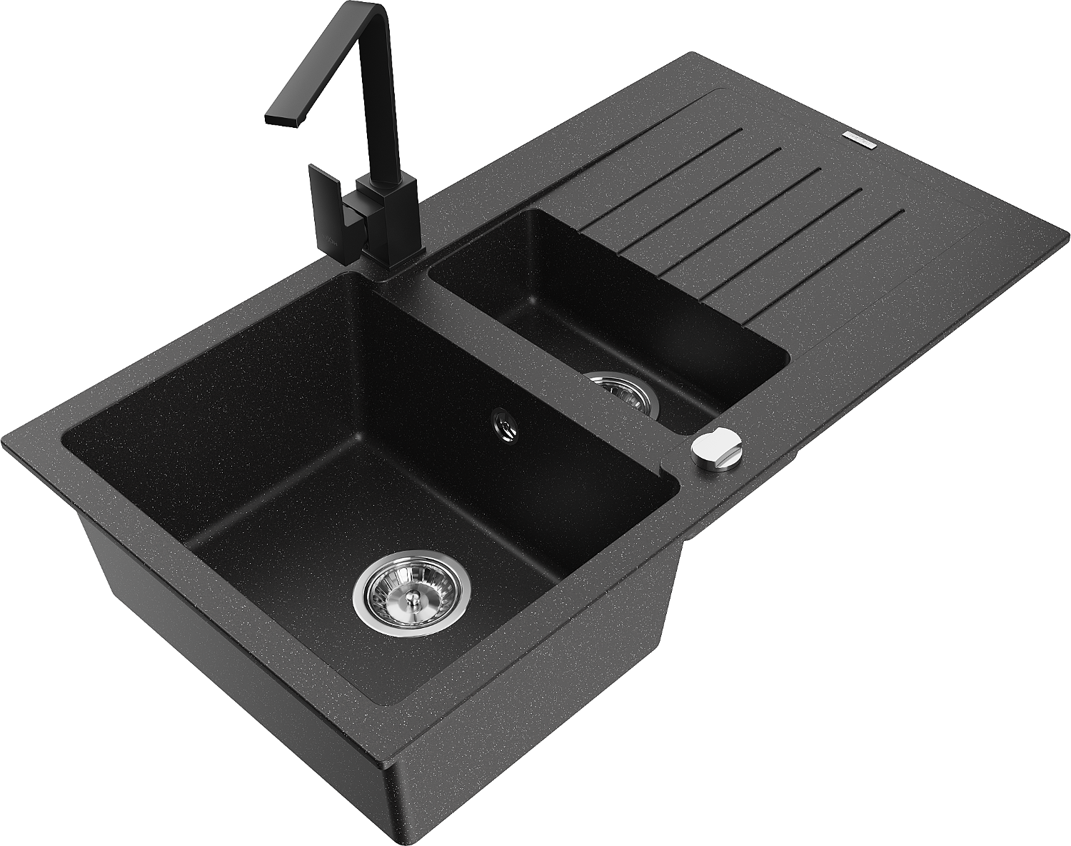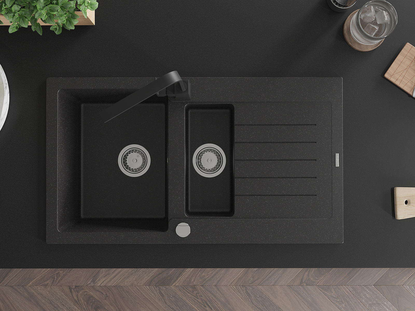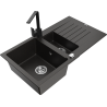 Mexen Matias granitový drez 1,5-komorový s odkvapkávačom a kuchynskou batériou Rita, čierny/strieborný metalik