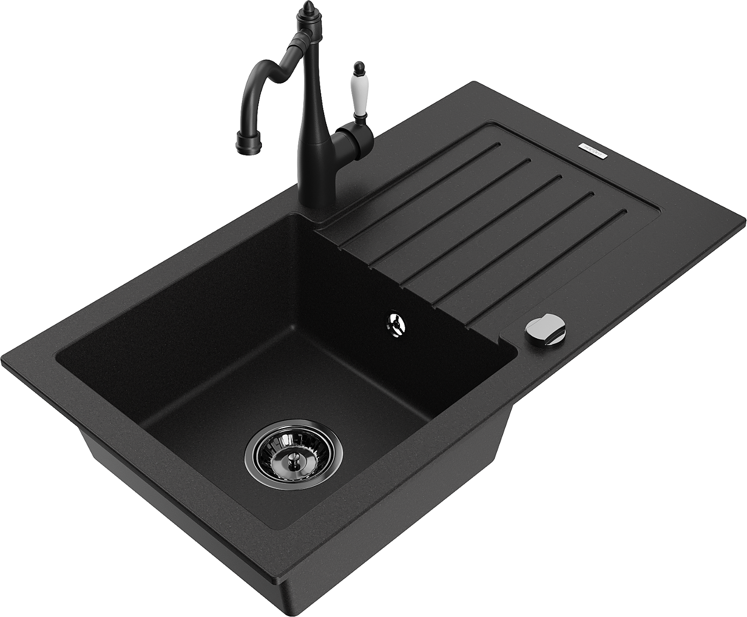 Mexen Pablo žulový umývadlový drez 1-komorový s odkvapkávačom a kuchynskou batériou Carla, čierny - 6510-77-670700-70-B