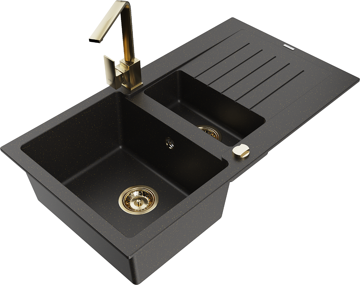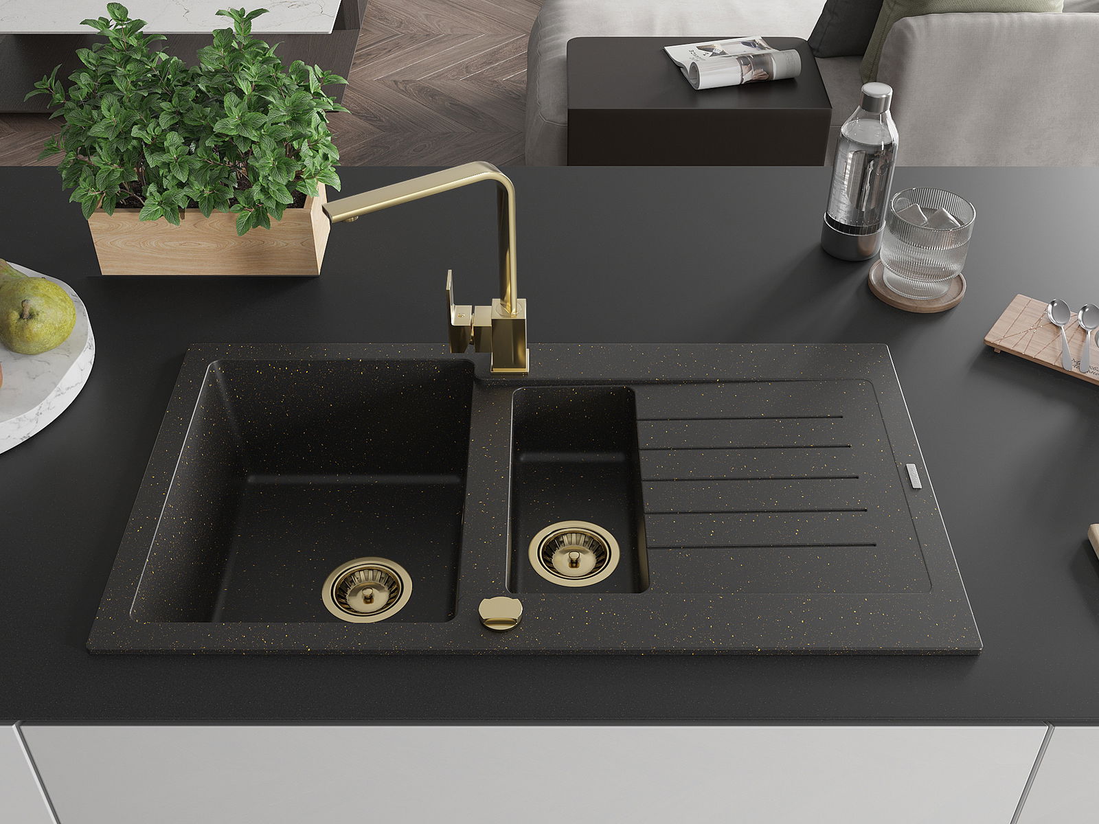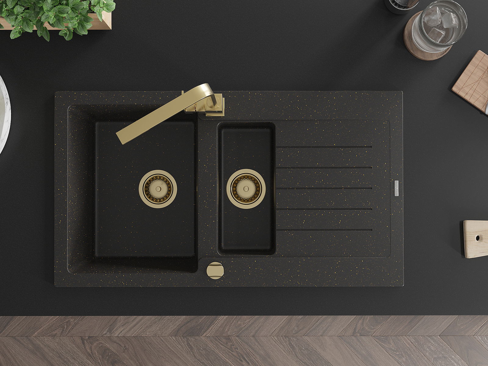 Mexen Matias granitový drez 1,5-komorový s odkvapkávačom a kuchynskou batériou Rita, čierny/zlatý - 6502-75-670300-50