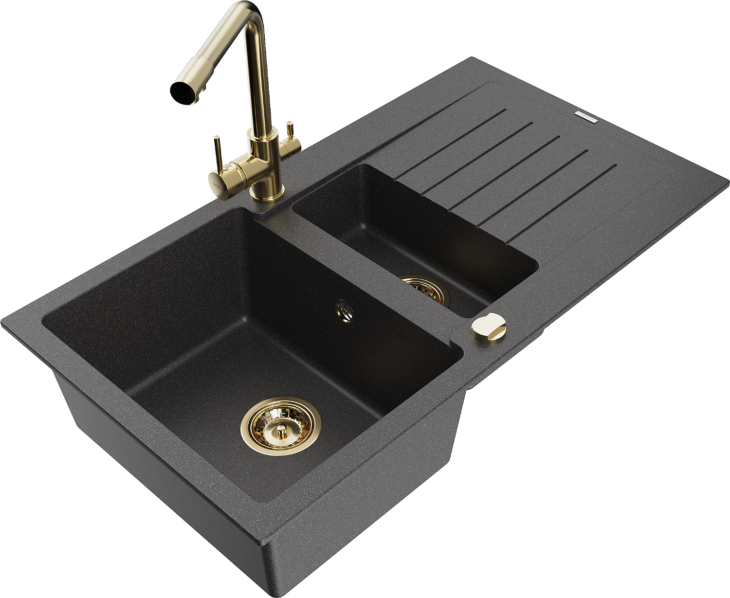 Mexen Matias žulový drez 1,5-komorový s odkvapkávačom a kuchynskou batériou Duero, čierny s bodkami - 6502-76-671600-50
