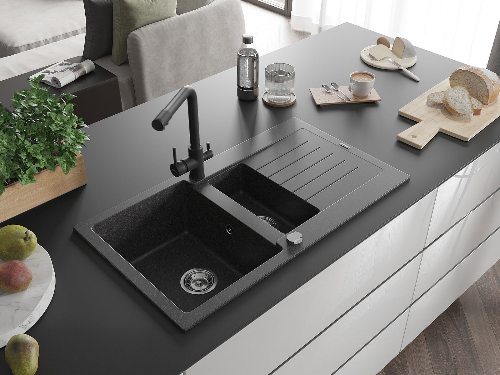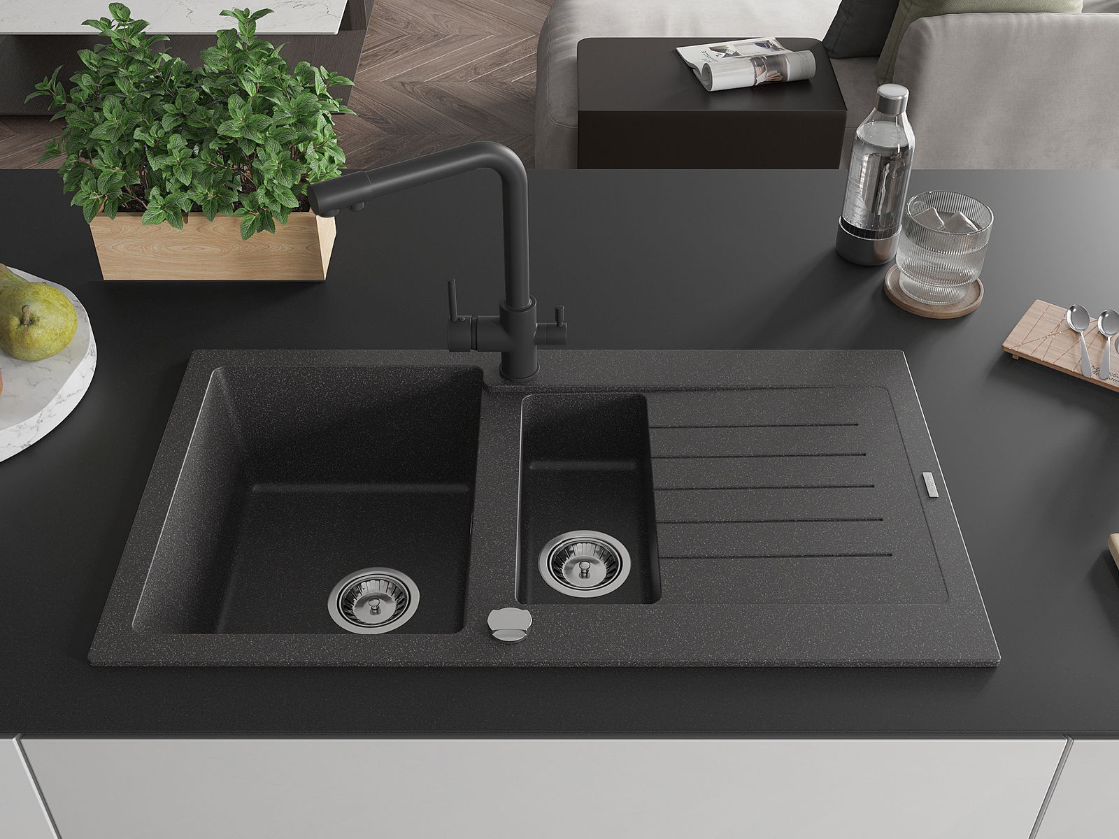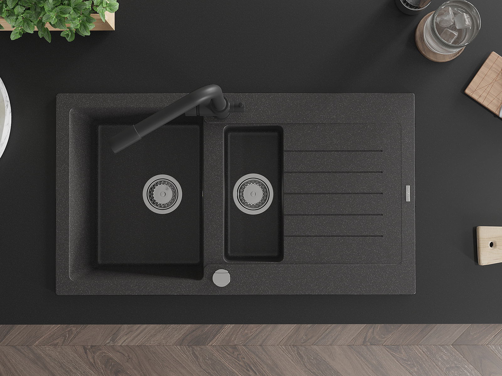 Povrch umývadla je odolný voči škvrnám a sfarbeniu, vďaka čomu sa ľahko čistí a zachováva si svoju farbu po dlhú dobu. Estetický a prakticky dopĺňajúci každú kuchyňu.