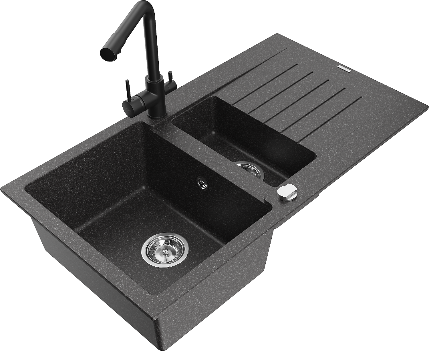 Mexen Matias žulový drez 1,5-komorový s odkvapkávačom a kuchynskou batériou Duero, čierny s fľakmi - 6502-76-671600-70