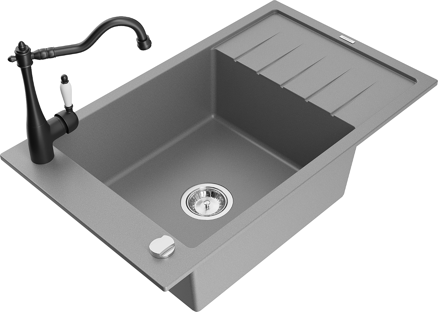 Mexen Elias žulový drez 1-komorový s odkvapkávačom a kuchynskou batériou Carla, sivý - 6511-71-670700-70