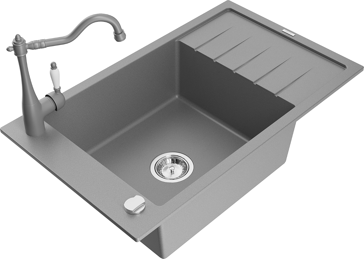 Mexen Elias žulový kuchynský drez s jednou komorou, s odkvapkávačom a kuchynskou batériou Carla, šedý - 6511-71-670700-71