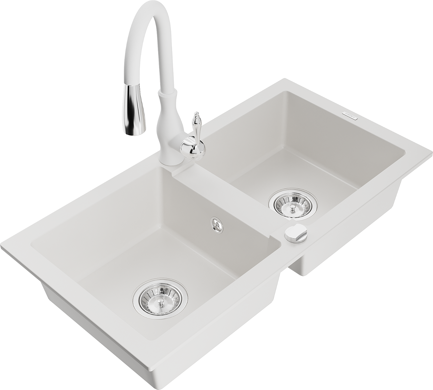 Mexen Mario granitový drez 2-komorový s kuchynskou batériou Savita, biely - 6504-20-672601-20