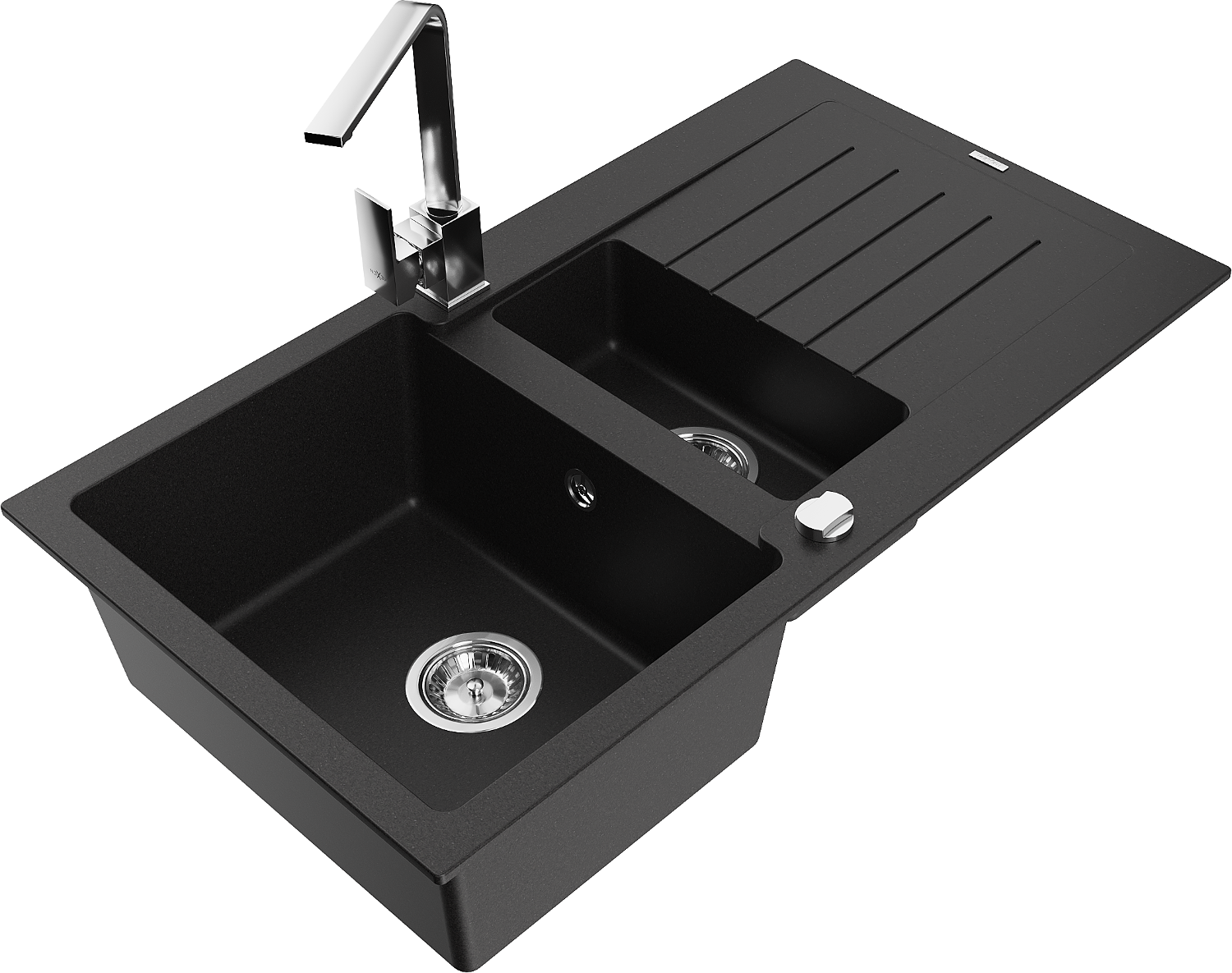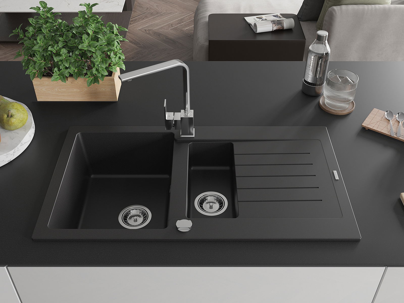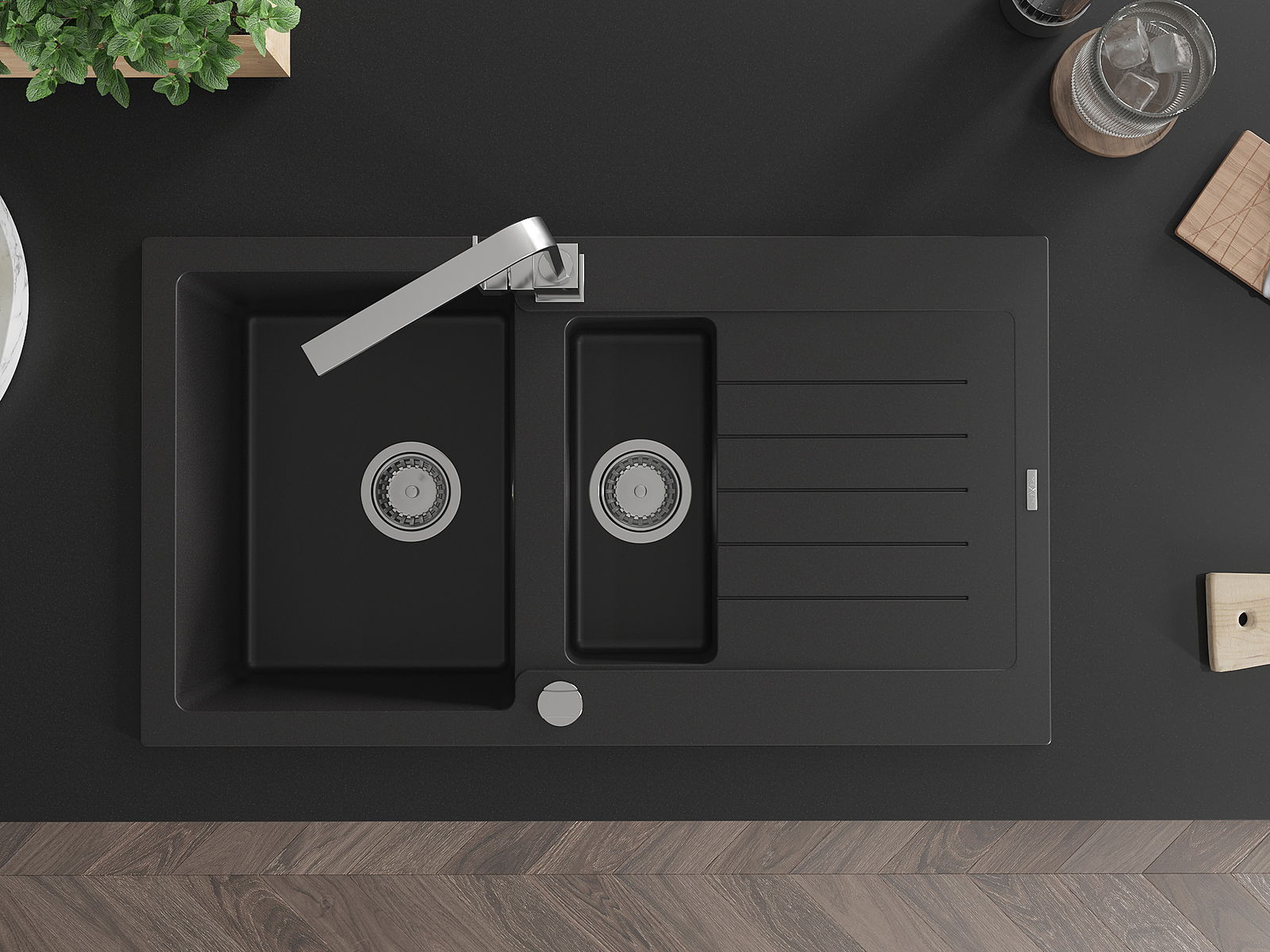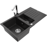 Mexen Matias žulový drez 1,5-komorový s odkvapkávačom a kuchynskou batériou Rita, čierny - 6502-77-670300-00