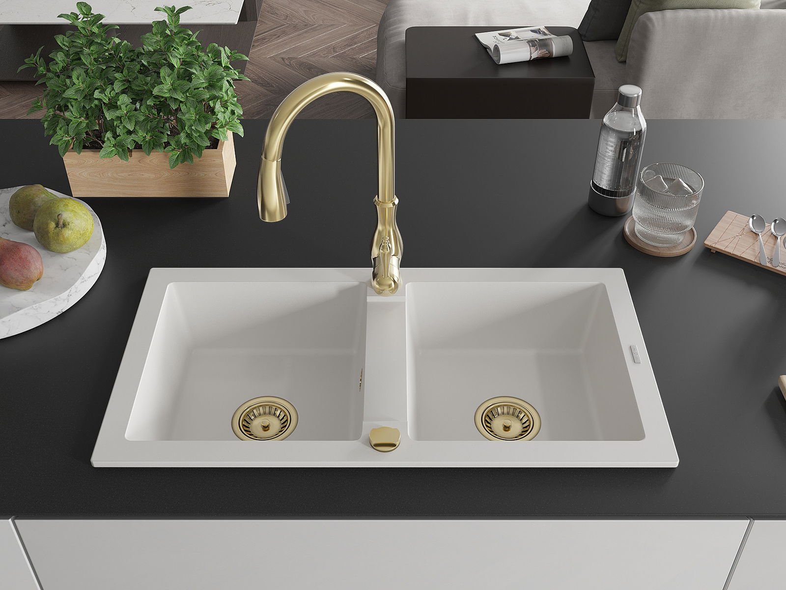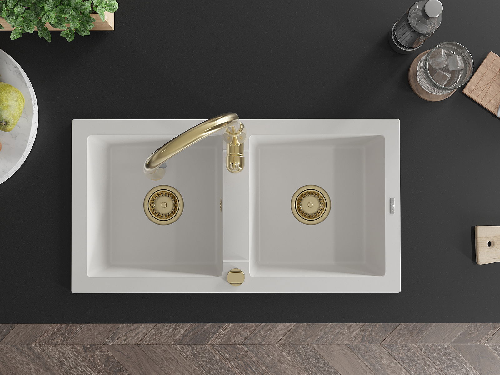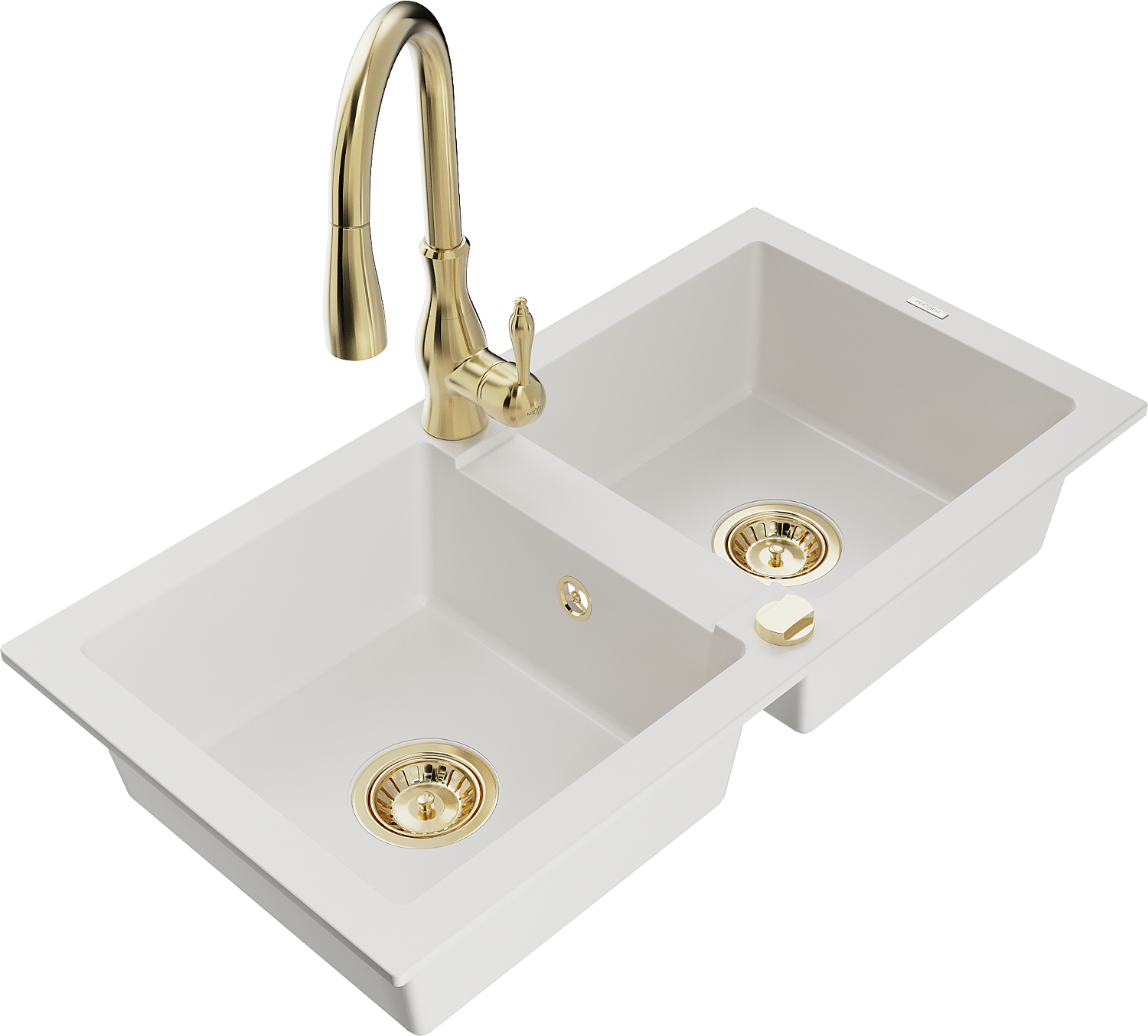 Mexen Mario dvojkomorový granitový drez s kuchynskou batériou Savita, biely - 6504-20-672601-50