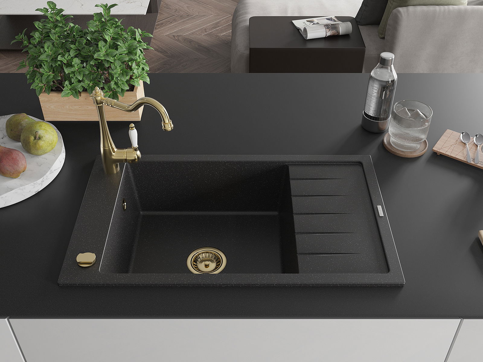 Mexen Elias žulový drez s 1 komorou s odkapávačom a kuchynskou batériou Carla, čierny/strieborný metalik - 6511-73-670700-50