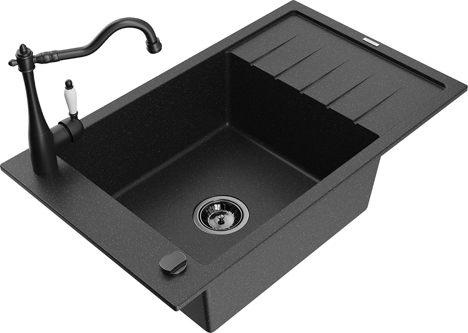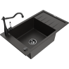 Mexen Elias granitový kuchynský drez s jednou komorou, odkvapkávačom a kuchynskou batériou Carla, čierny/strieborný