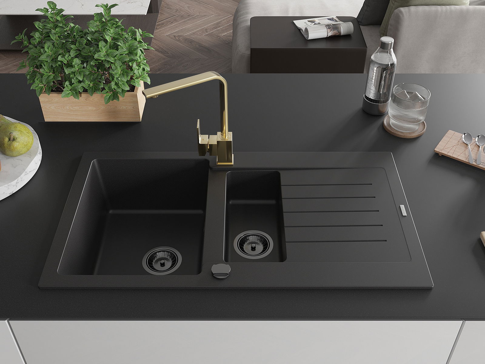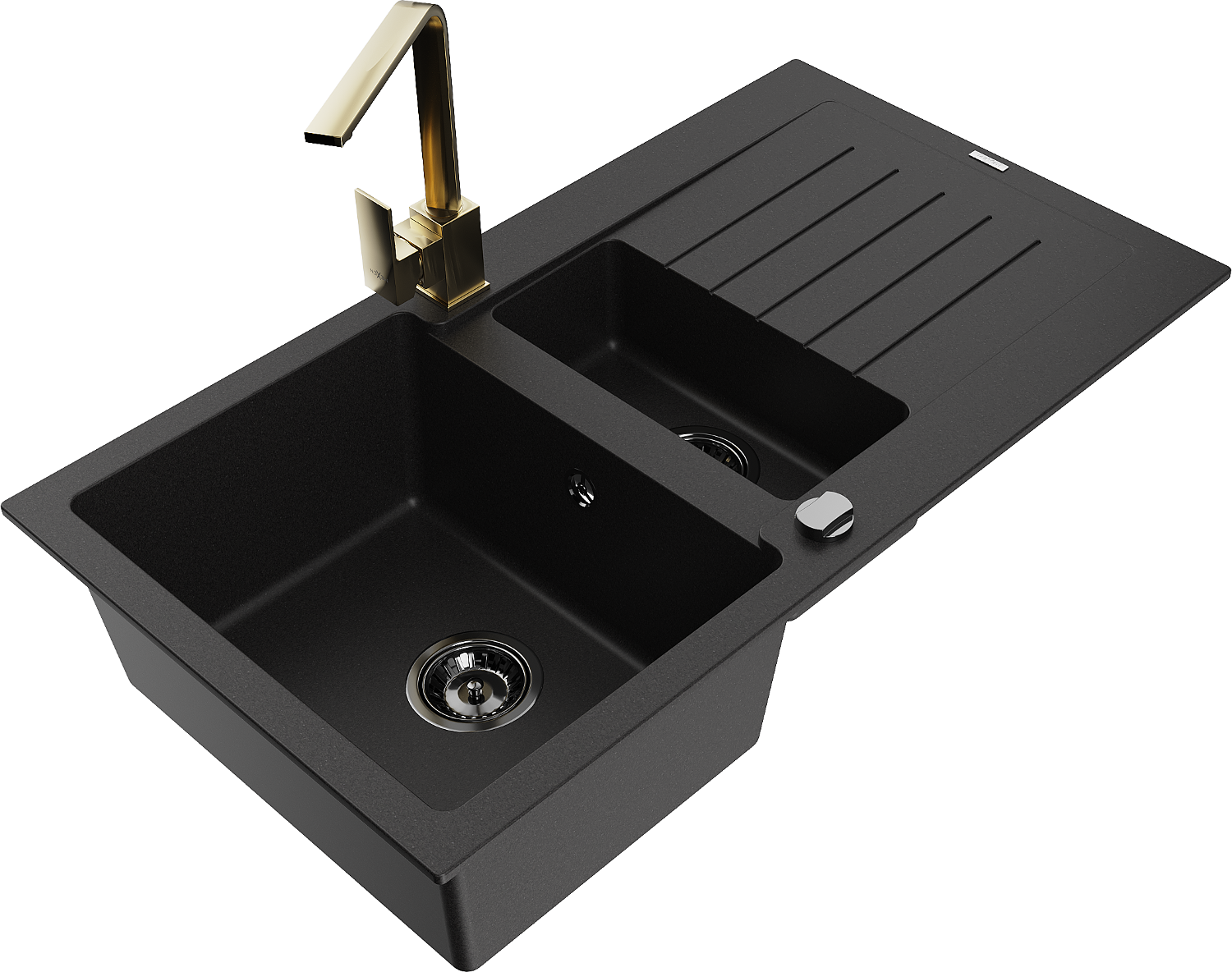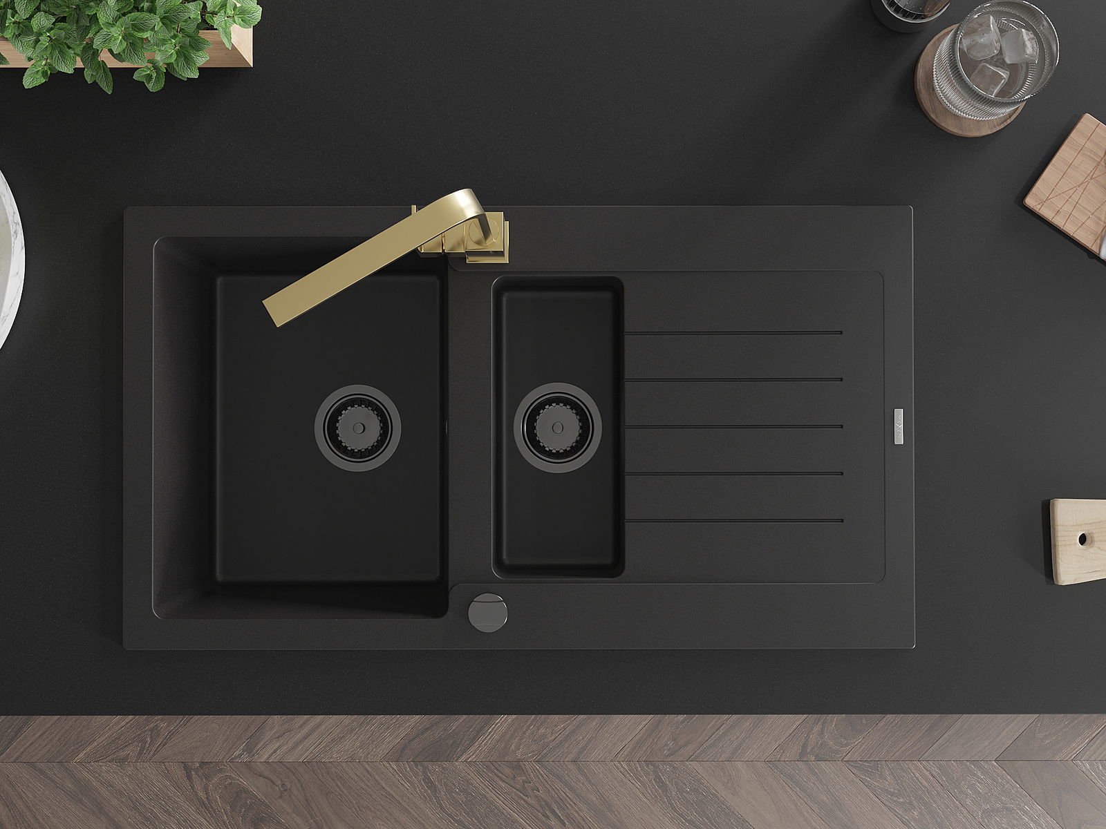 Mexen Matias žulový drez s 1,5 komorami, odkvapkávacou plochou a kuchynskou batériou Rita, čierny - 6502-77-670300-50-B