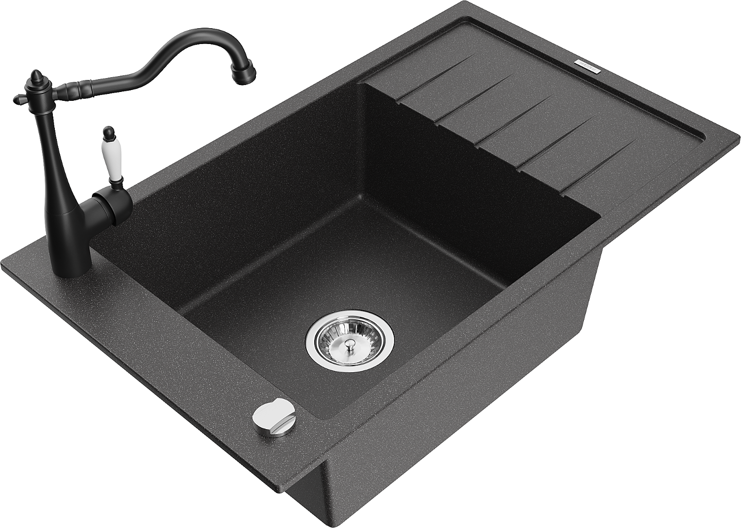 Mexen Elias granitový drez 1-komorový s odkvapkávačom a kuchynskou batériou Carla, čierny s postriekaním - 6511-76-670700-70