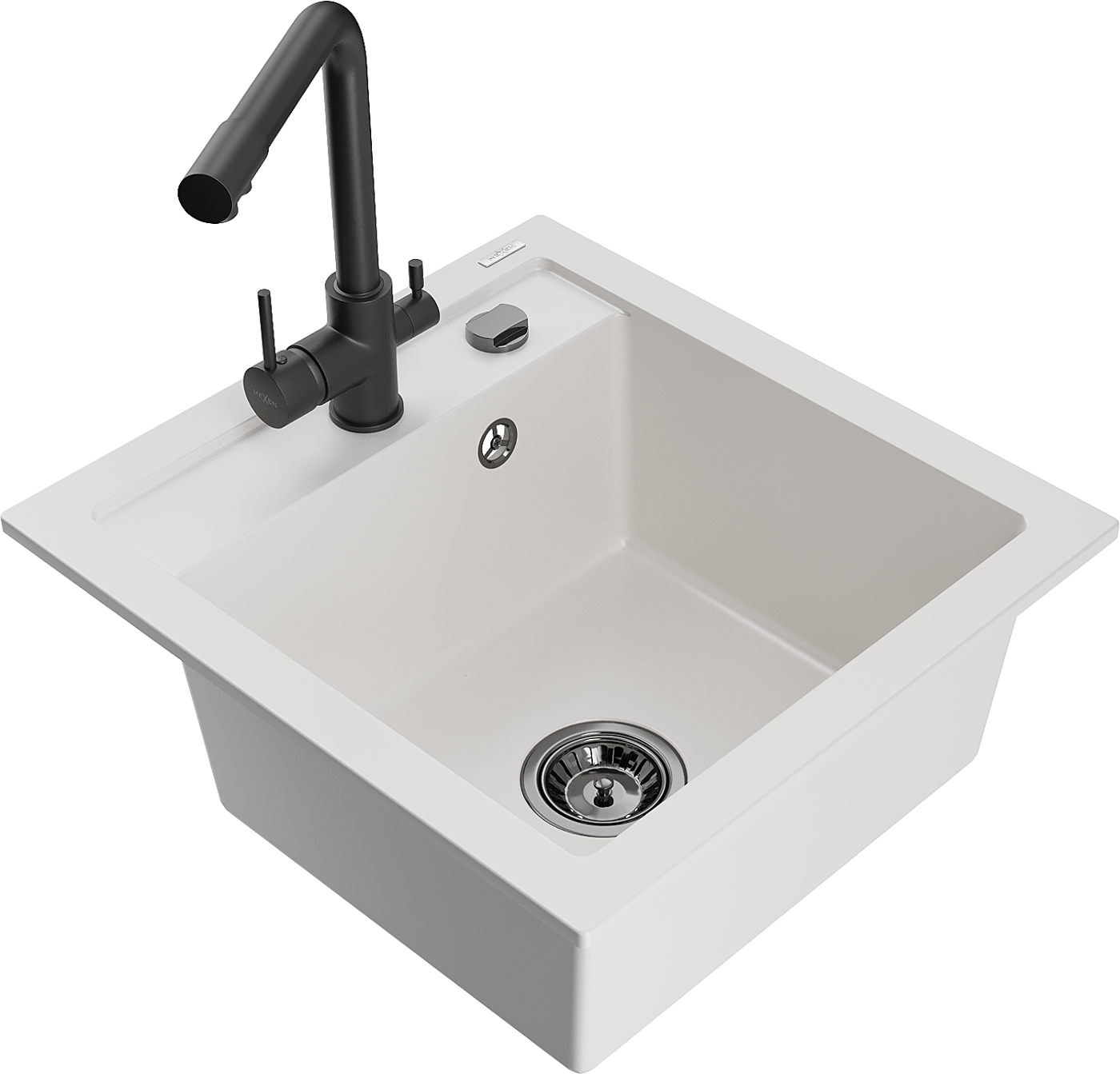Mexen Vito žulový drez 1-komorový s kuchynskou batériou Duero, biely - 6503-20-671600-70