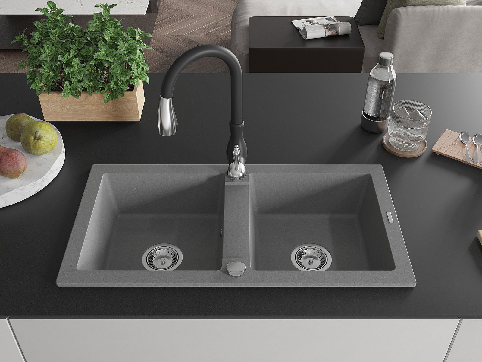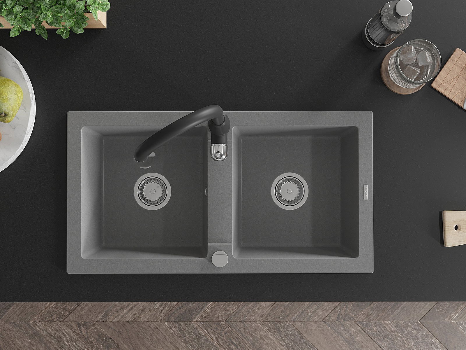 Mexen Mario žulový drez 2-komorový s kuchynskou batériou Savita, sivý - 6504-71-672601-70