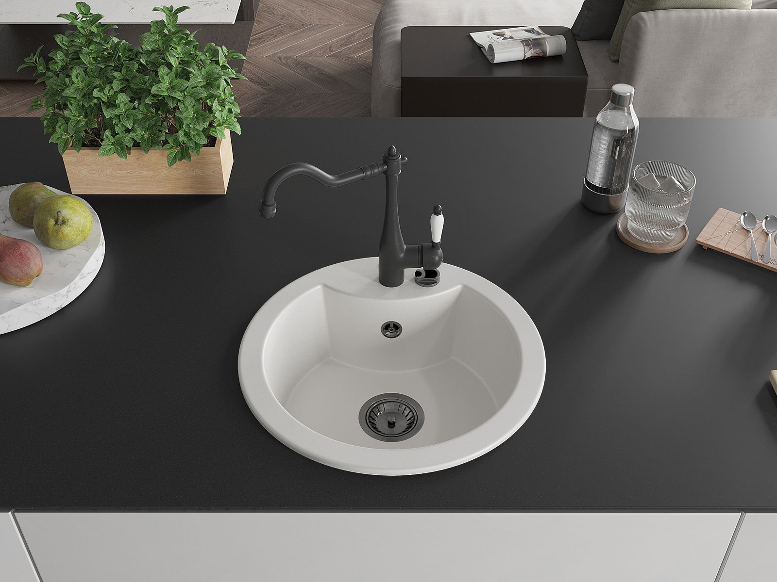Povrch umývadla je odolný voči škvrnám a sfarbeniu, vďaka čomu sa ľahko čistí a zachováva si svoju farbu po dlhú dobu. Estetický a prakticky dopĺňajúci každú kuchyňu.