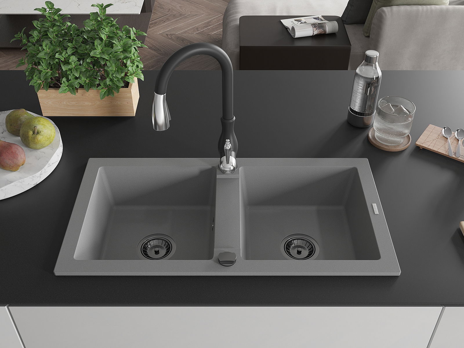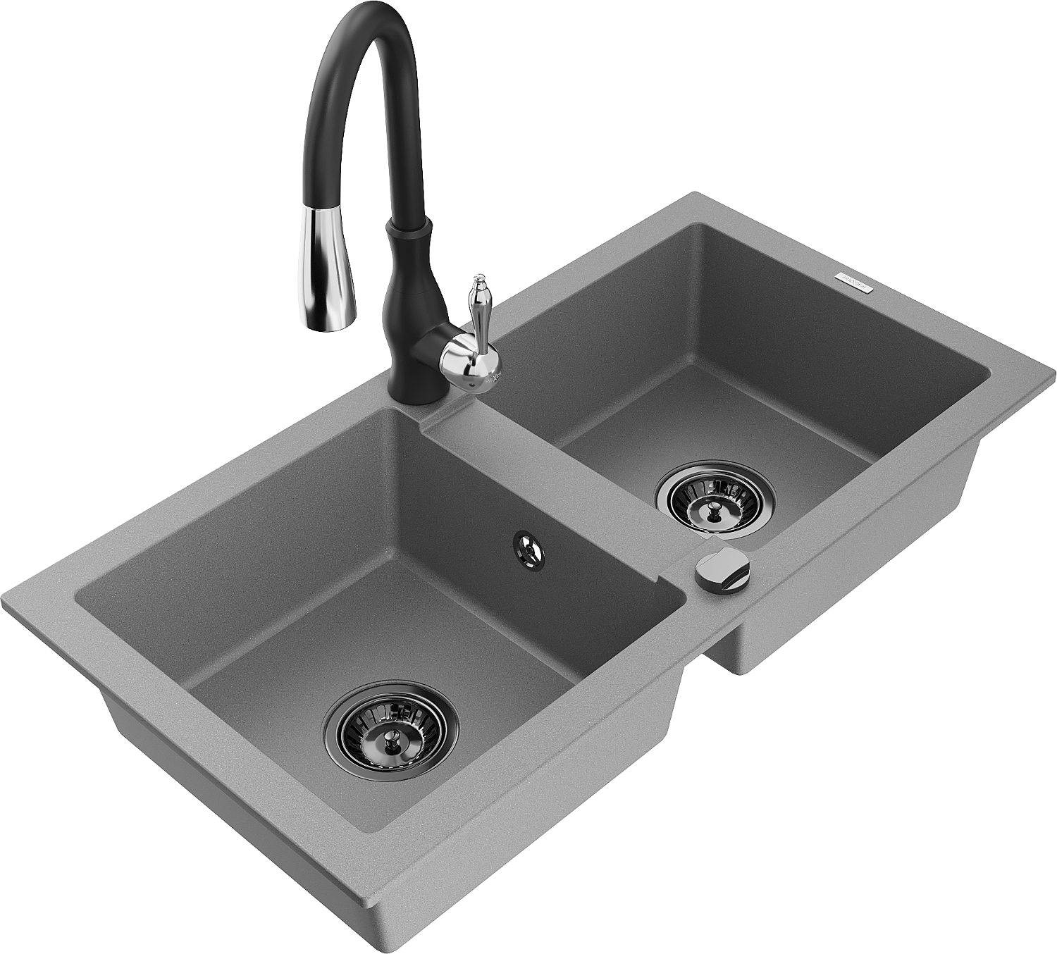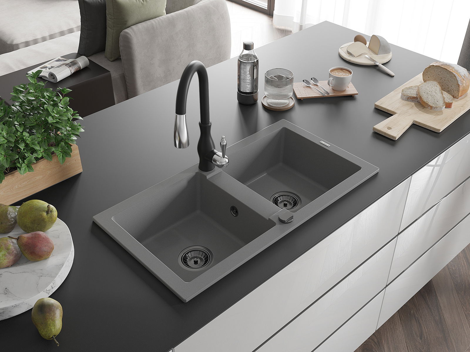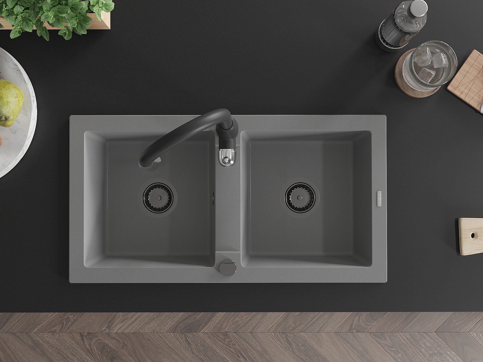 Mexen Mario dvojkomorový žulový kuchynský drez s kuchynskou batériou Savita, sivý - 6504-71-672601-70-B