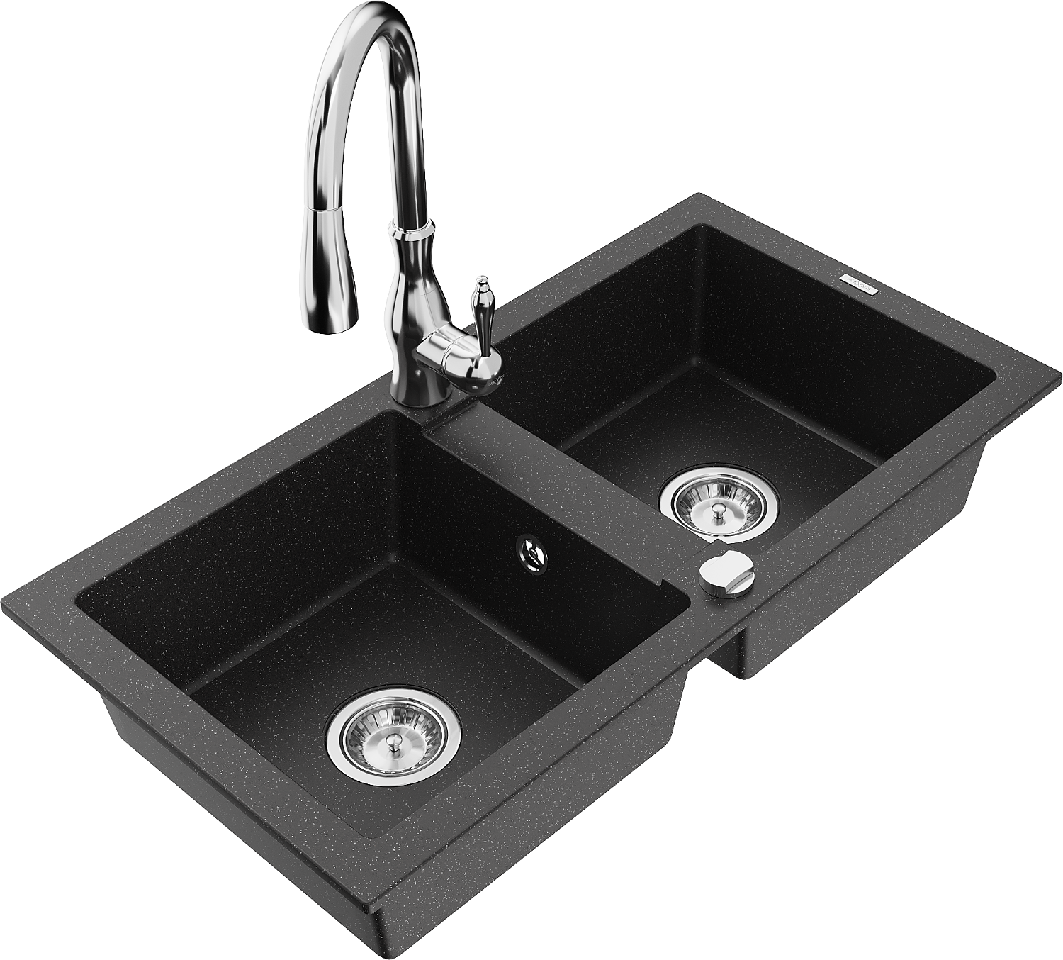 Mexen Mario žulový drez 2-komorový s kuchynskou batériou Savita, čierny/strieborný metalický - 6504-73-672601-00
