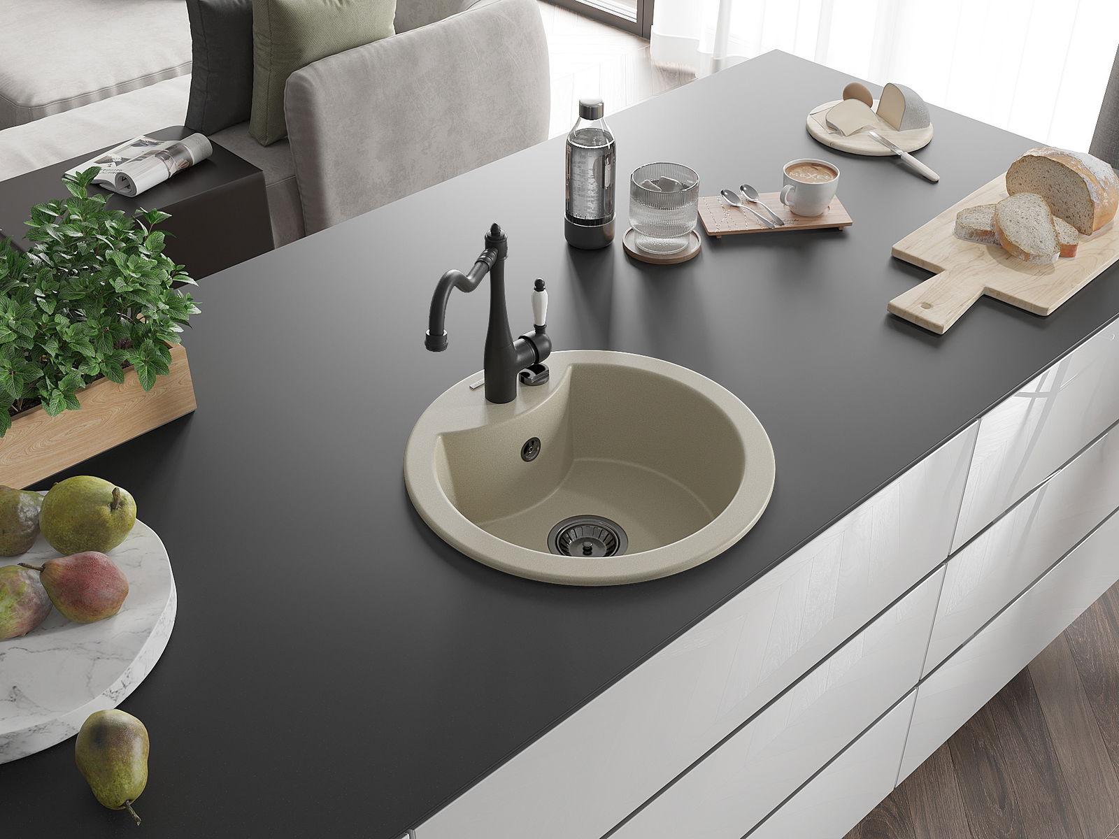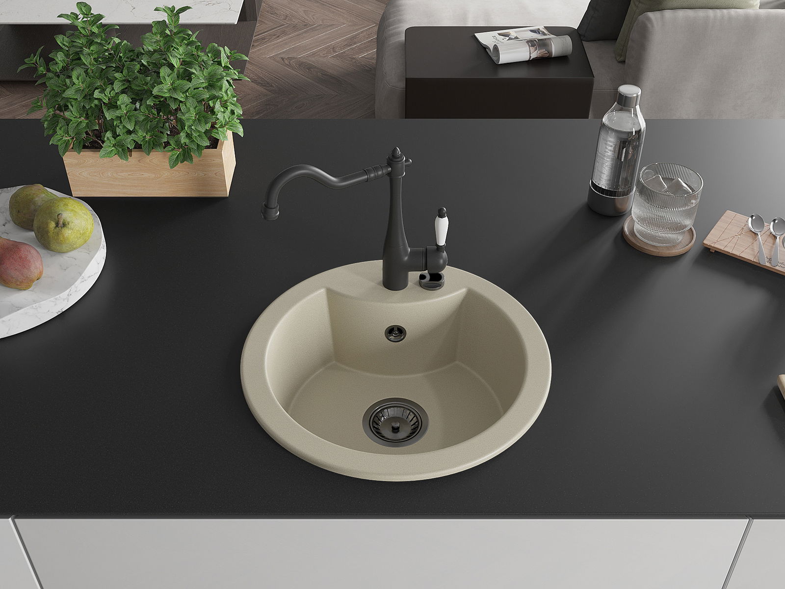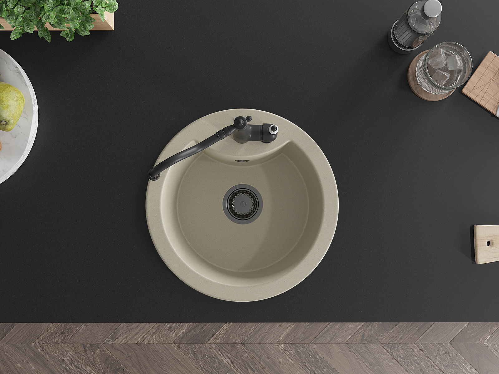 Povrch umývadla je odolný voči škvrnám a sfarbeniu, vďaka čomu sa ľahko čistí a zachováva si svoju farbu po dlhú dobu. Estetický a prakticky dopĺňajúci každú kuchyňu.