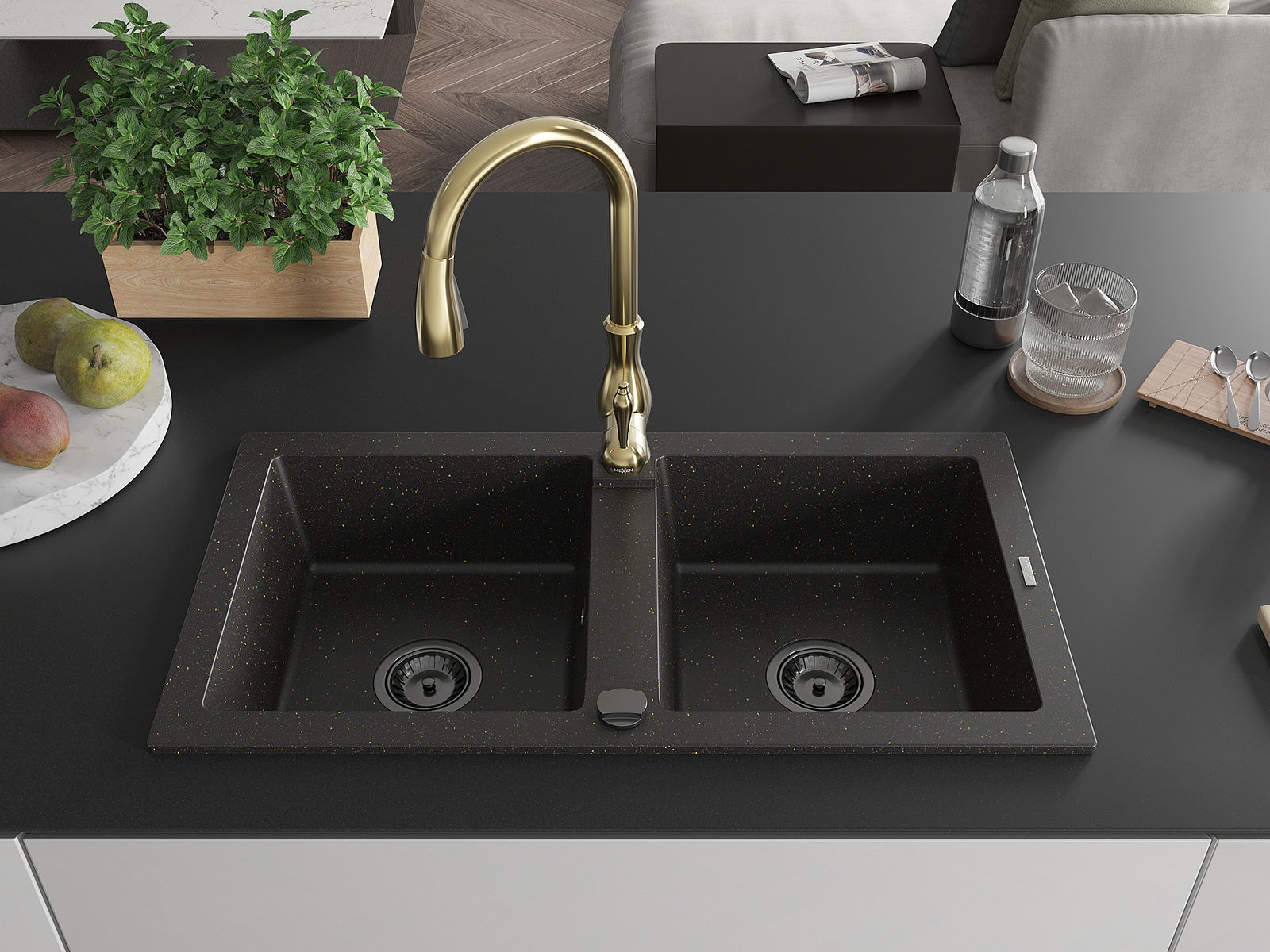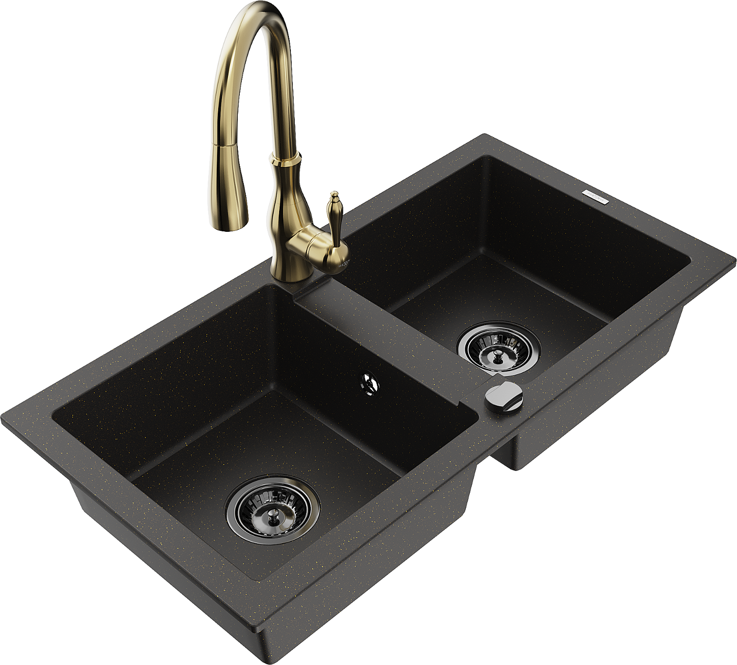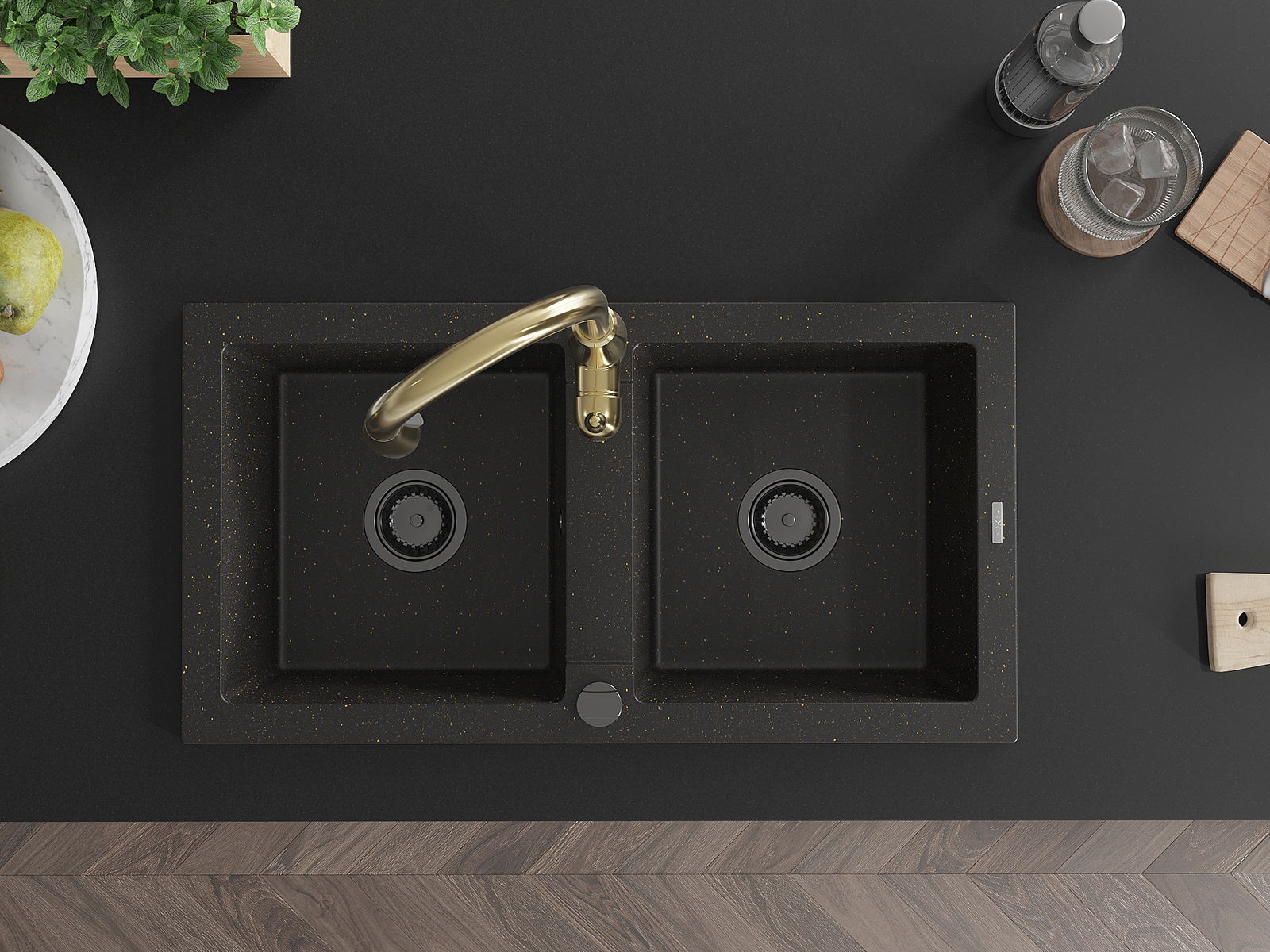 Mexen Mario granitový drez dvojkomorový s kuchynskou batériou Savita, čierny/zlatý metalik - 6504-75-672601-50-B