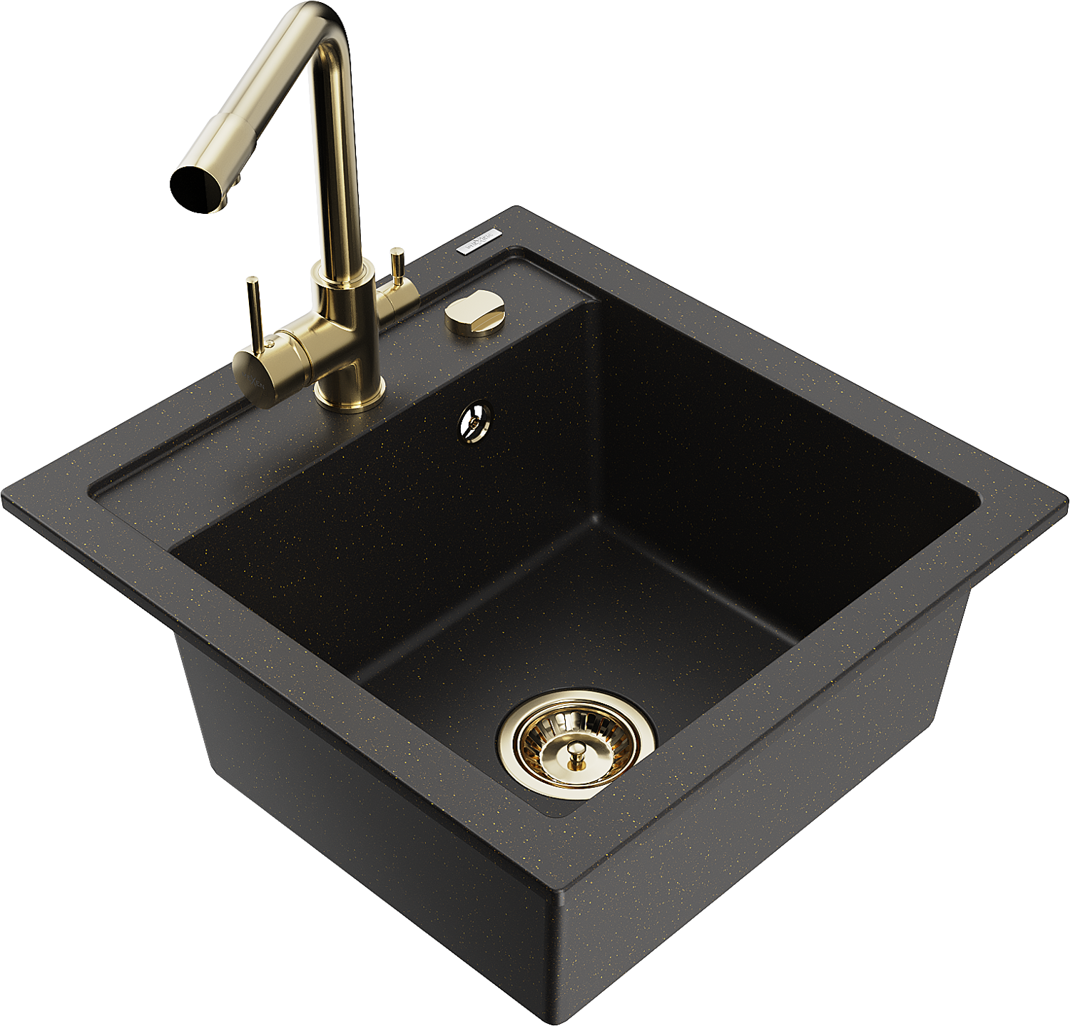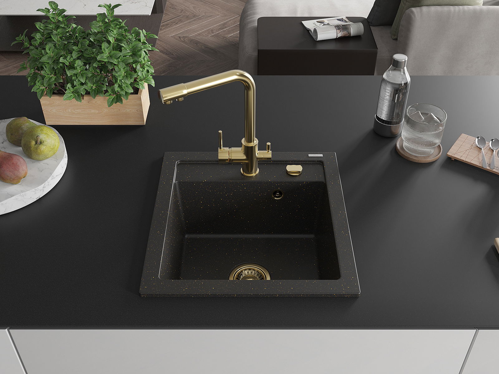 Mexen Vito kuchynský drez 1-komorový s kuchynskou batériou Duero, čierny/zlatý metalik - 6503-75-671600-50