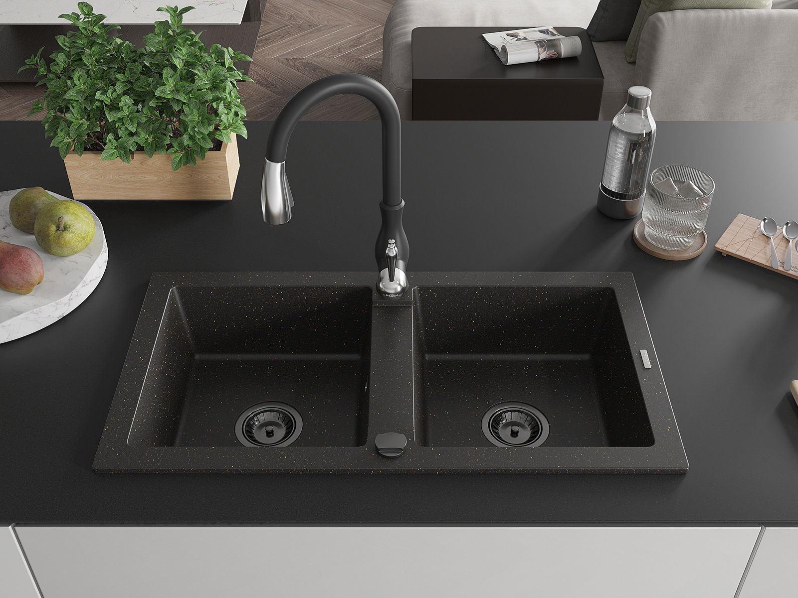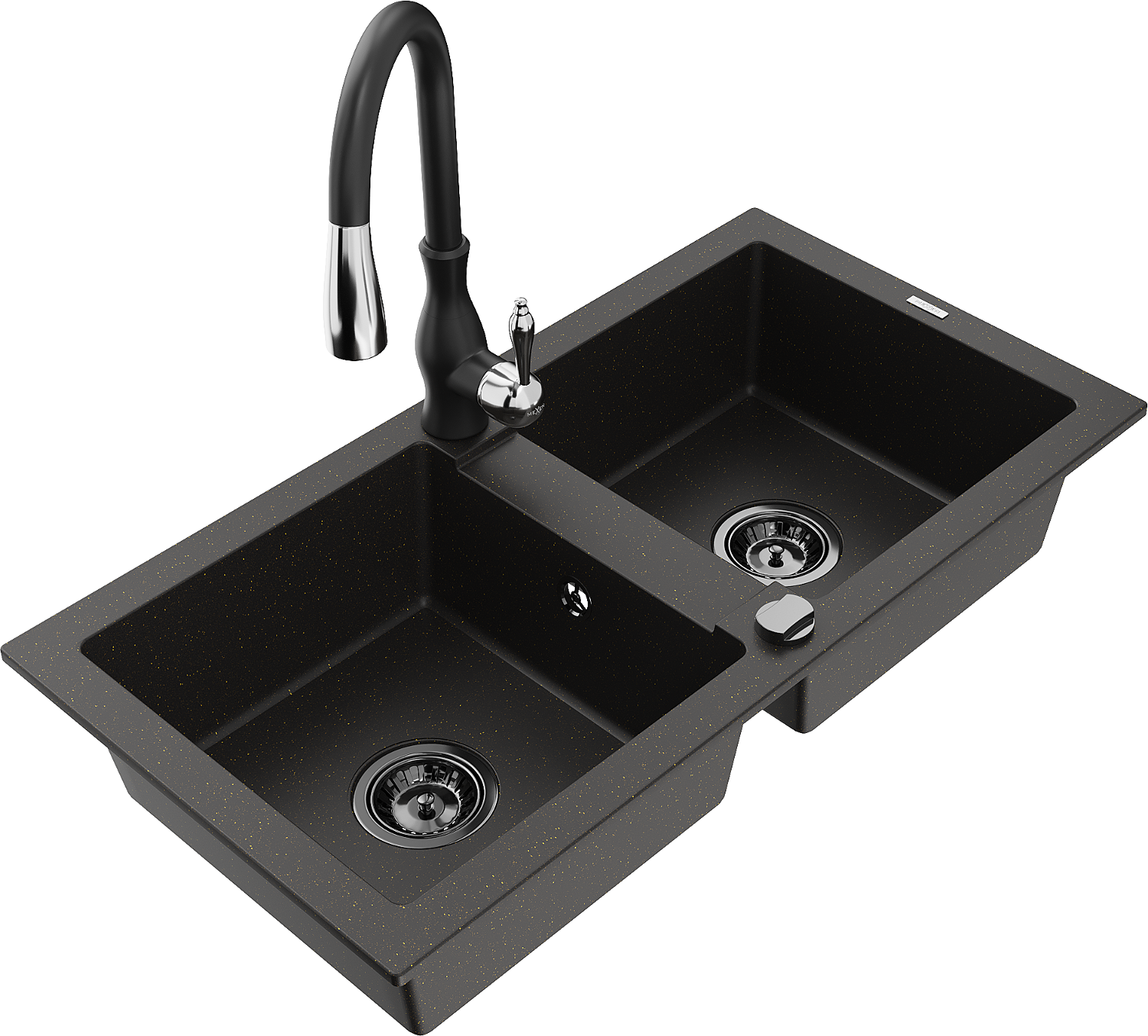 Mexen Mario žulový drez 2-komorový s kuchynskou batériou Savita, čierny/zlatý metalik - 6504-75-672601-70-B