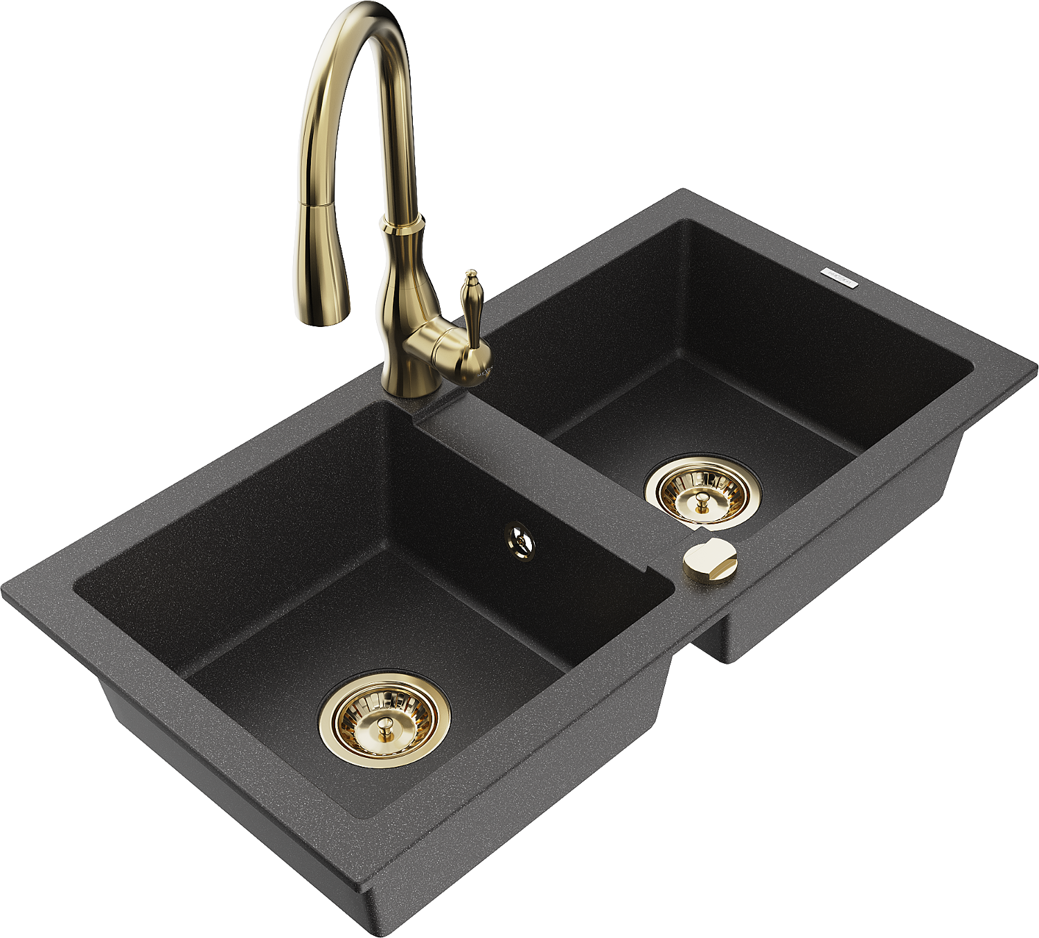 Mexen Mario žulový dvojkomorový drez s kuchynskou batériou Savita, čierny kropenatý - 6504-76-672601-50