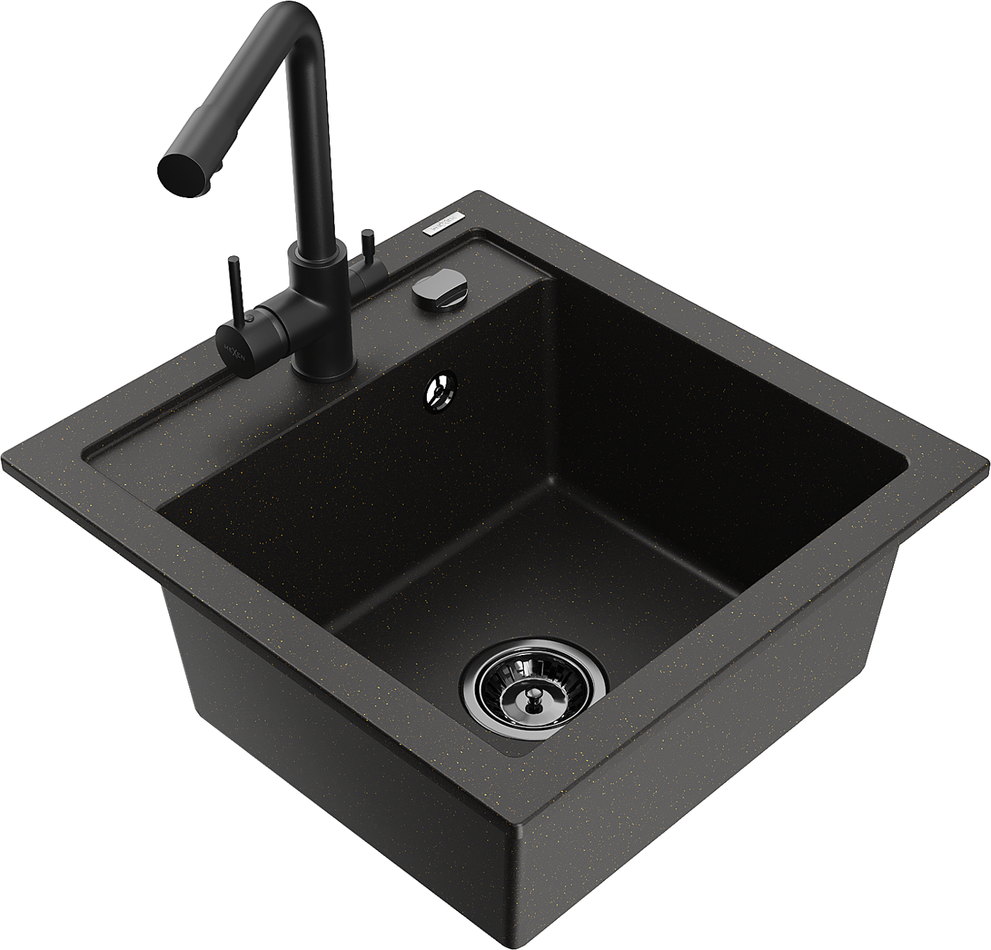 Mexen Vito žulový drez s 1 komorou s kuchynskou batériou Duero, čierny/zlatý metalik - 6503-75-671600-70-B