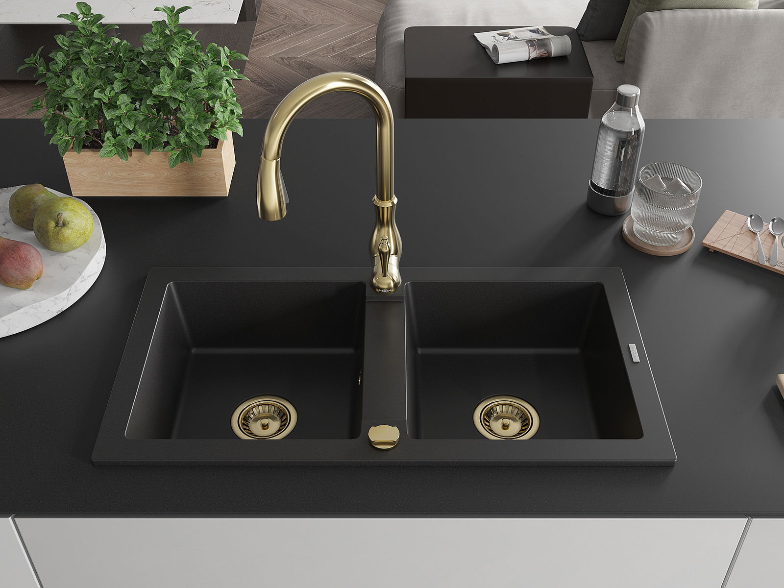 Mexen Mario granitový kuchynský drez 2-komorový s kuchynskou batériou Savita, čierny - 6504-77-672601-50