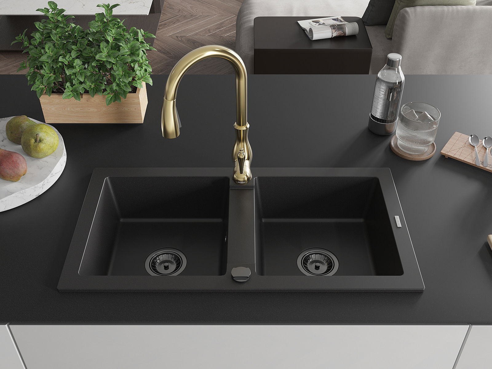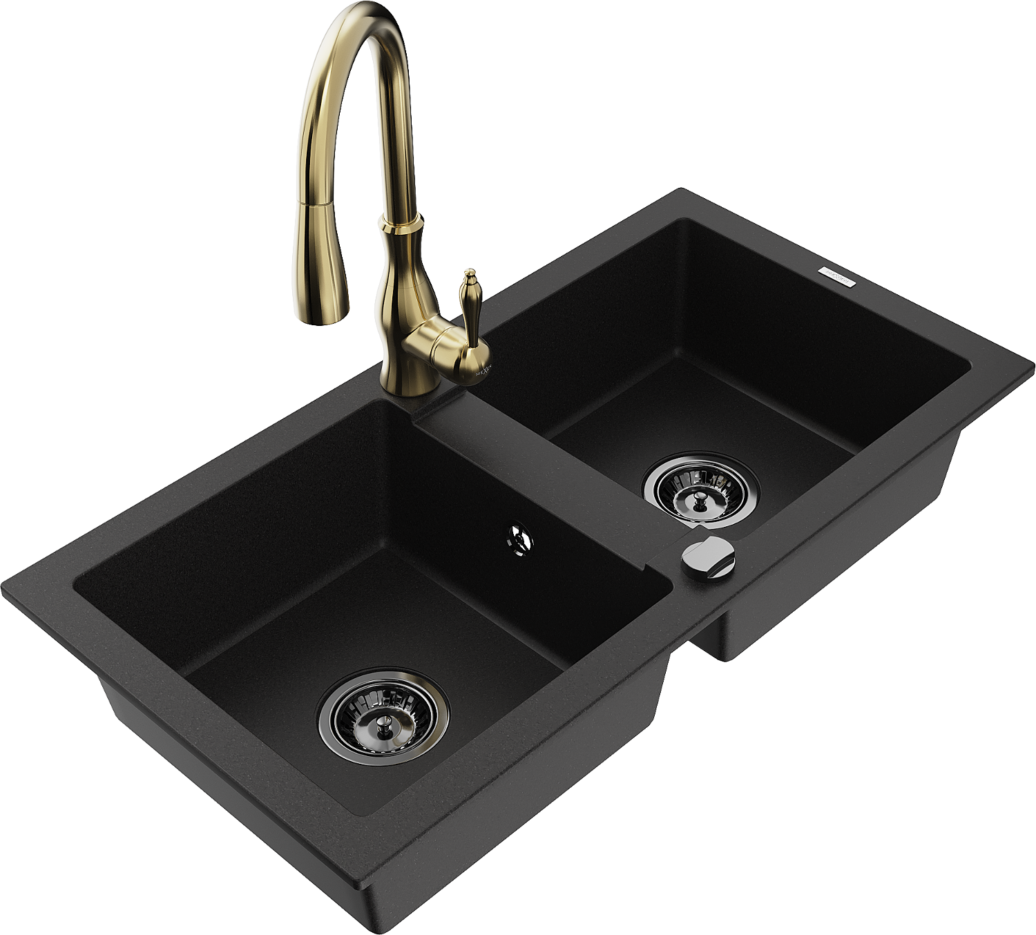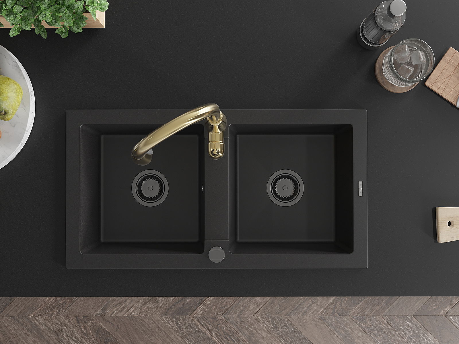 Mexen Mario žulový kuchynský drez 2-komorový s kuchynskou batériou Savita, čierny - 6504-77-672601-50-B