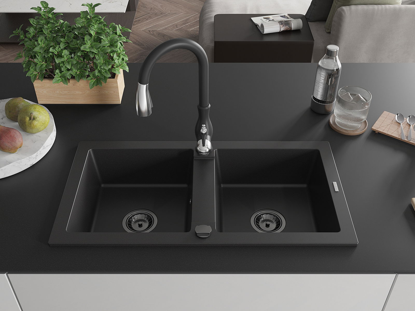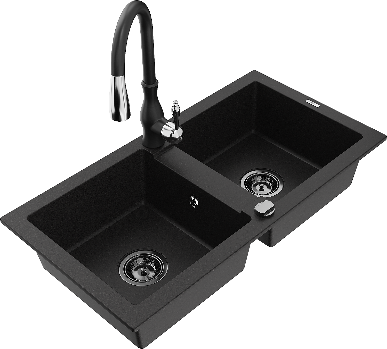 Mexen Mario granitový drez 2-komorový s kuchynskou batériou Savita, čierny - 6504-77-672601-70-B
